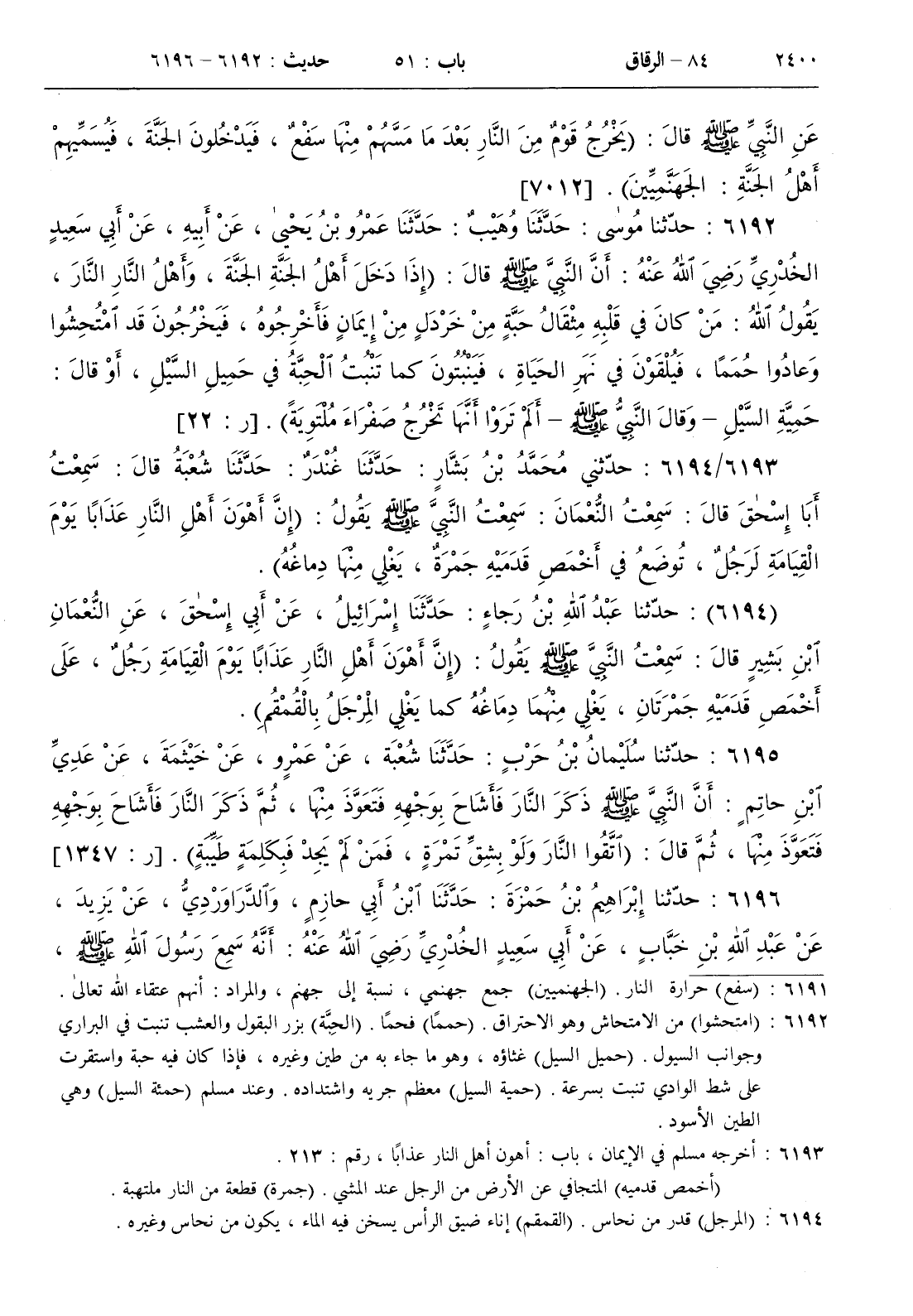[ ش ( امتحشوا ) من الامتحاش وهو الاحتراق . ( حمما ) فحما . ( الحبة ) بزر البقول والعشب تنبت في البراري وجوانب السيول . ( حميل السيل ) غثاؤه وهو ما جاء به من طين وغيره فإذا كان فيه حبة واستقرت على شط الوادي تنبت بسرعة . ( حمية السيل ) معظم جريه واشتداده . وعند مسلم ( حمئة السيل ) وهي الطين الأسود ]