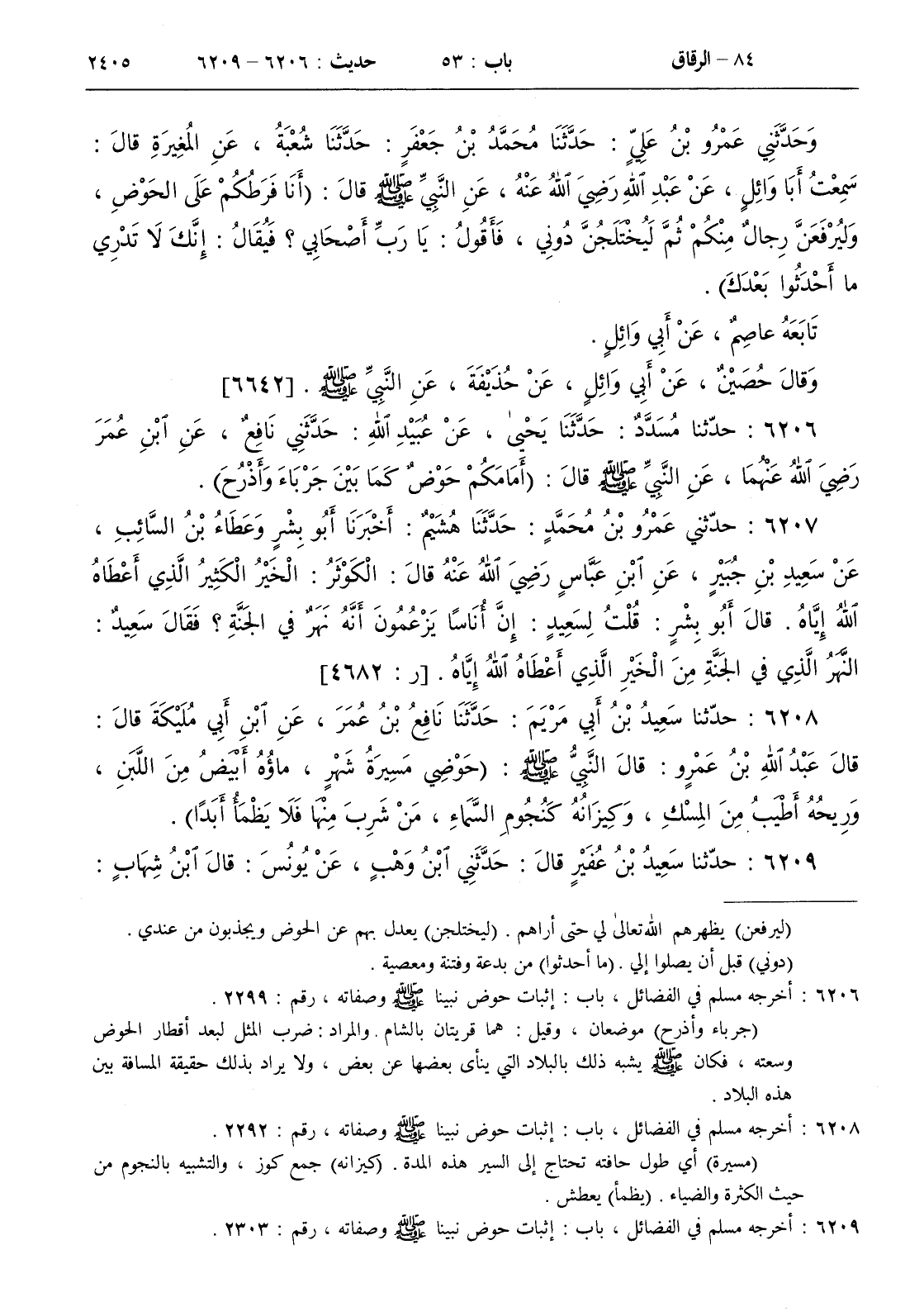 : أن رسول الله صلى الله عليه و سلم قال ( إن قدر حوضي كما بين أيلة وصنعاء من اليمن وإن فيه من الأباريق كعدد نجوم السماء )