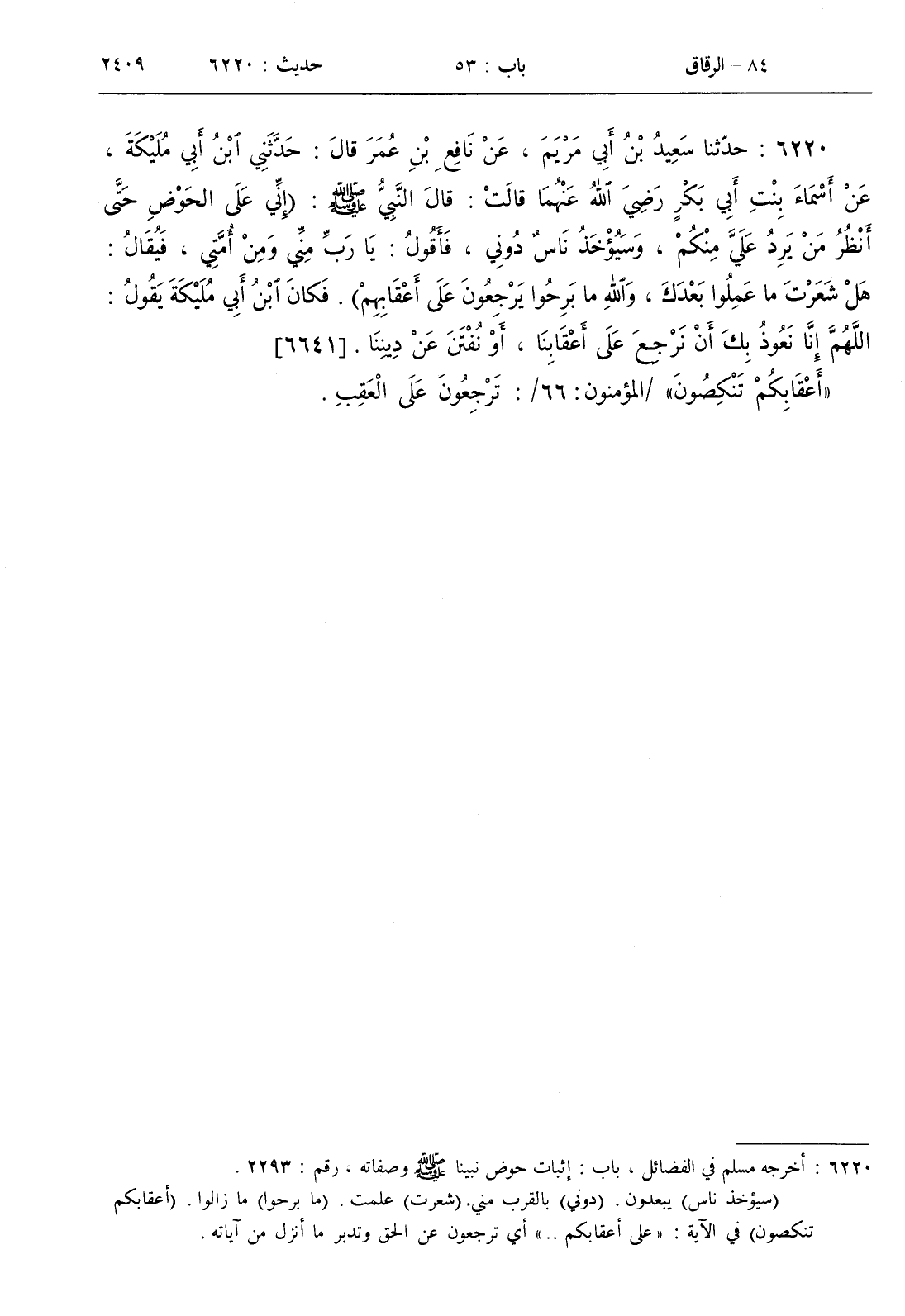: قال النبي صلى الله عليه و سلم ( إني على الحوض حتى أنظر من يرد علي منكم وسيؤخذ ناس دوني فأقول يا رب مني ومن أمتي فيقال هل شعرت ما عملوا بعدك والله ما برحوا يرجعون على أعقابهم ) . فكان ابن أبي مليكة يقول اللهم إنا نعوذ بك أن نرجع على أعقابنا أو نفتن عن ديننا