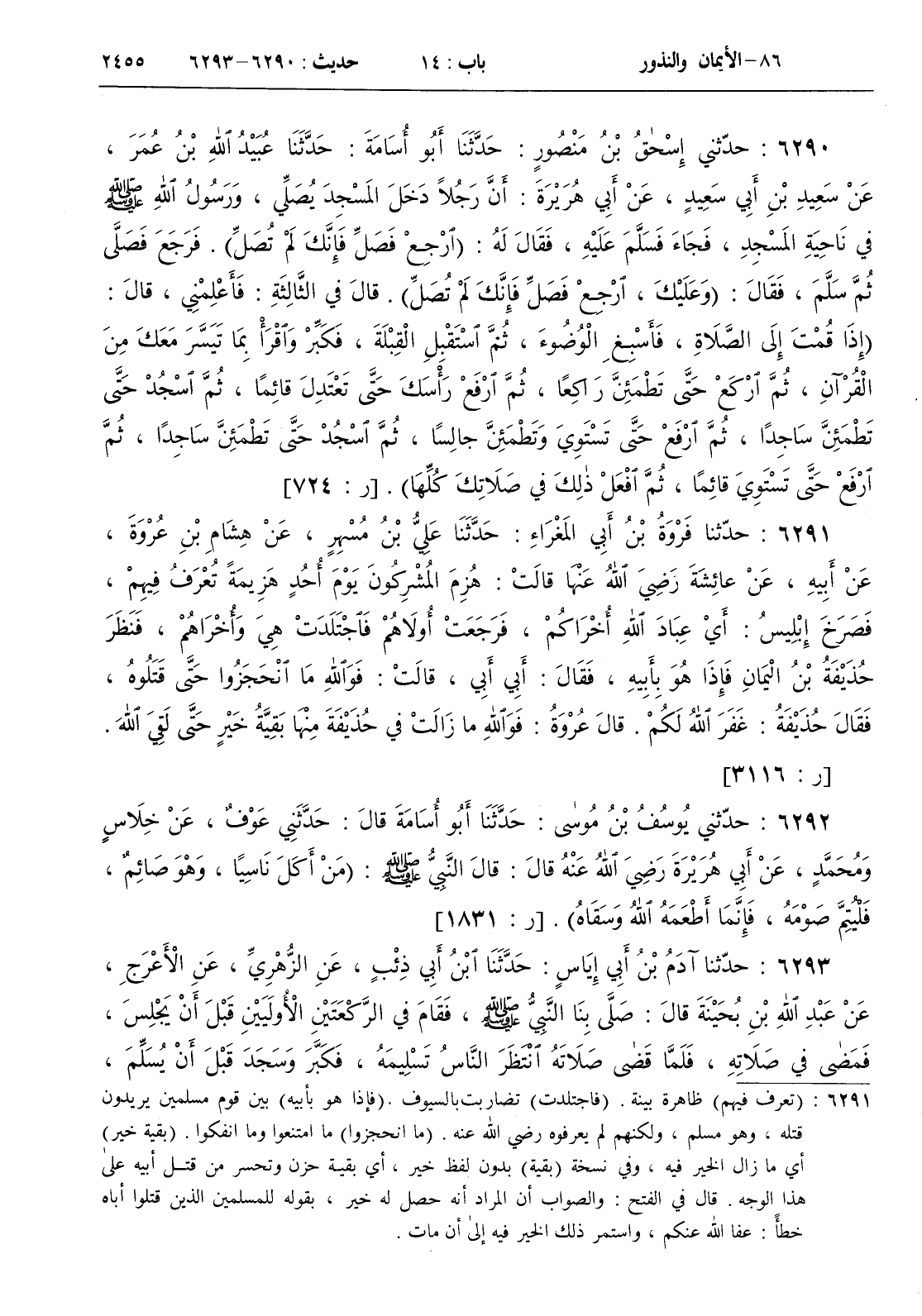 [ ش ( تعرف فيهم ) ظاهرة بينة . ( فاجتلدت ) تضاربت بالسيوف . ( فإذا هو بأبيه ) بين قوم مسلمين يريدون قتله وهو مسلم ولكنهم لم يعرفوه رضي الله عنه . ( ما انحجزوا ) ما امتنعوا وما انفكوا . ( بقية خير ) أي ما زال الخير فيه وفي نسخة ( بقية ) بدون لفظ خير أي بقية حزن وتحسر من قتل أبيه على هذا الوجه . قال في الفتح والصواب أن المراد أنه حصل له خير بقوله للمسلمين الذين قتلوا أباه خطأ عفا الله عنكم واستمر ذلك الخير فيه إلى أن مات ]