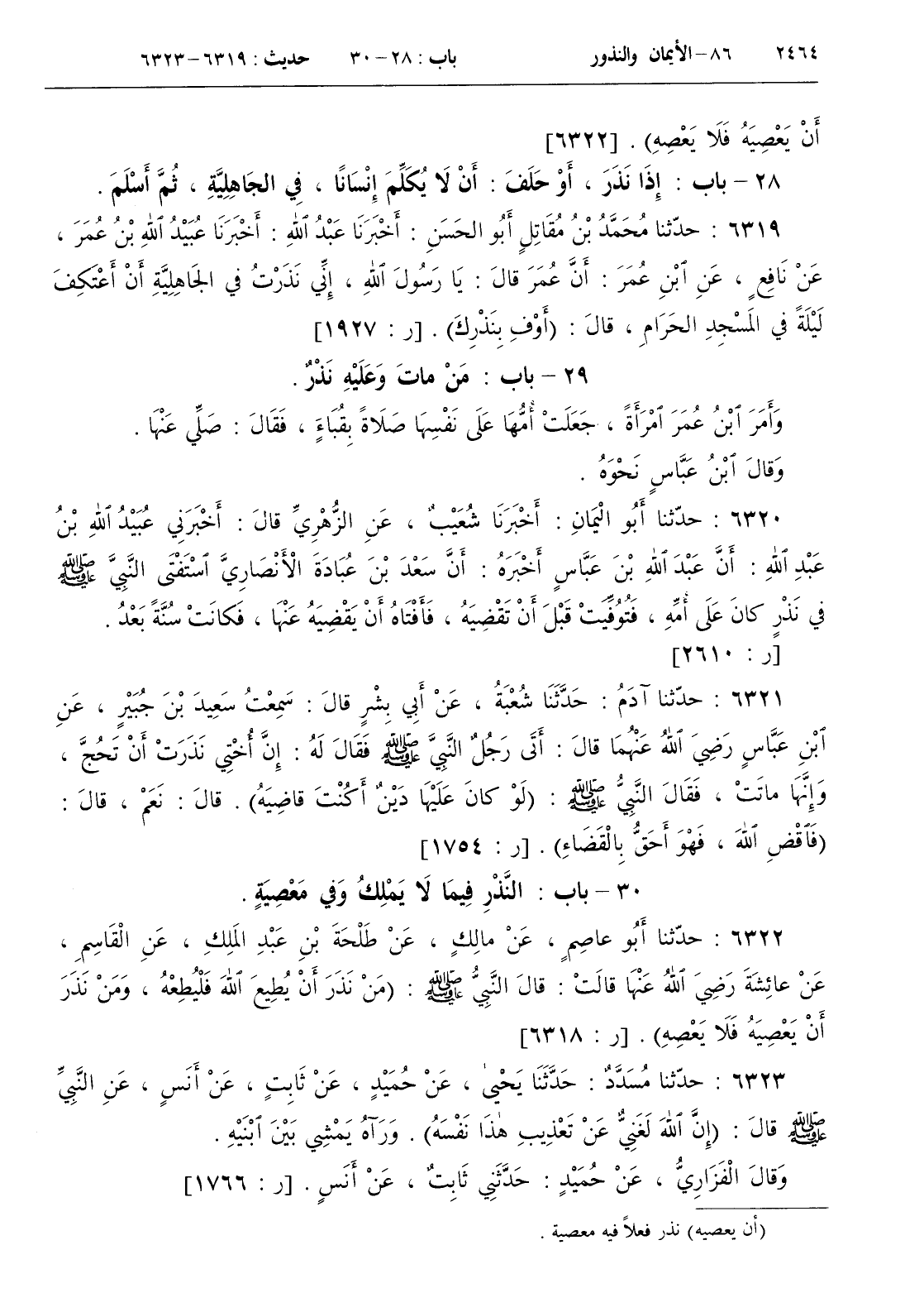 : قال النبي صلى الله عليه و سلم ( من نذر أن يطيع الله فليطعه ومن نذر أن يعصيه فلا يعصه )