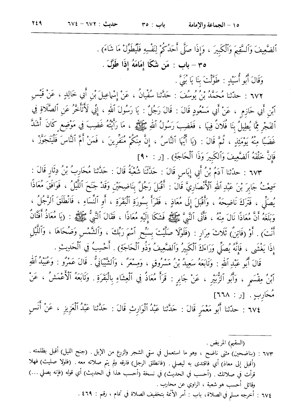 [ ش ( بناضحين ) مثنى ناضح وهو ما استعمل في سقي الشجر والزرع من الإبل . ( جنح الليل ) أقبل بظلمته . ( أقبل إلى معاذ ) أي فاقتدى به ليصلي . ( فانطلق الرجل ) فارقه ولم يتم صلاته معه . ( فلولا صليت ) فهلا قرأت في صلاتك . ( أحسب في الحديث ) في نسخة ( أحسب هذا في الحديث ) أي قوله ( فإنه يصلي... ) وقائل أحسب هو شعبة الراوي عن محارب ]