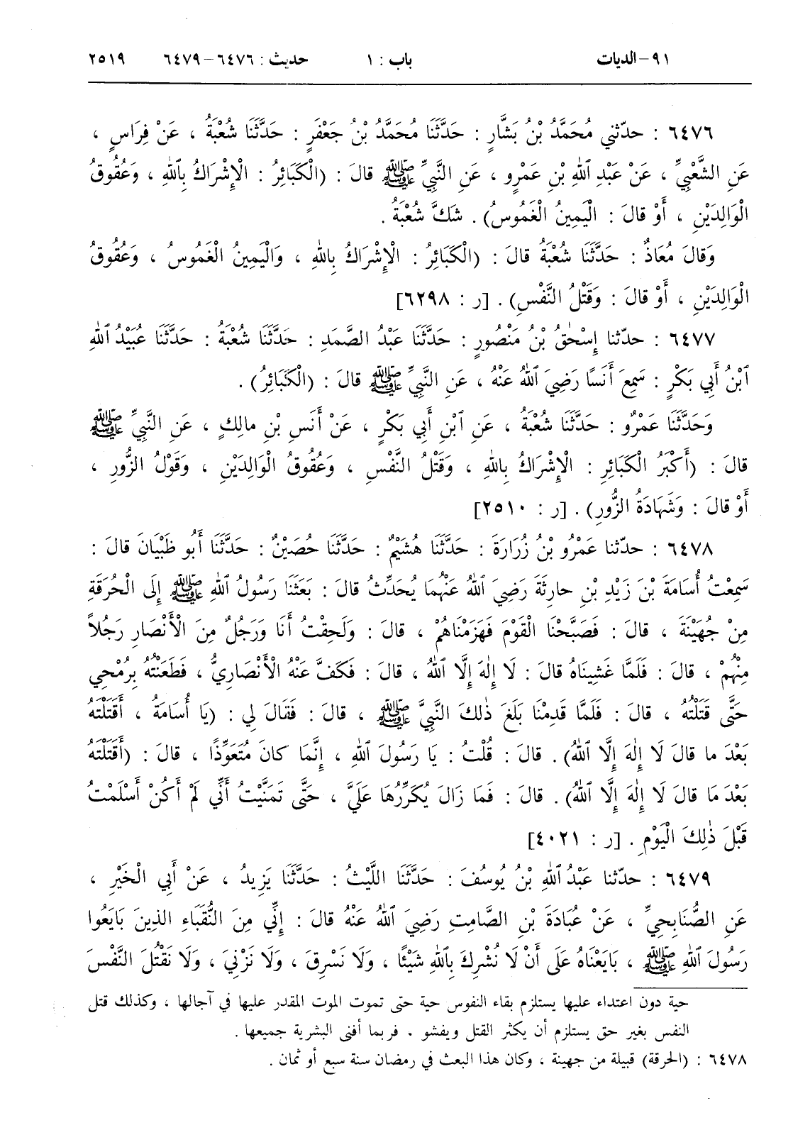 6476 - حدثني محمد بن بشار حدثنا محمد بن جعفر حدثنا شعبة عن فراس عن الشعبي عن عبد الله بن عمرو