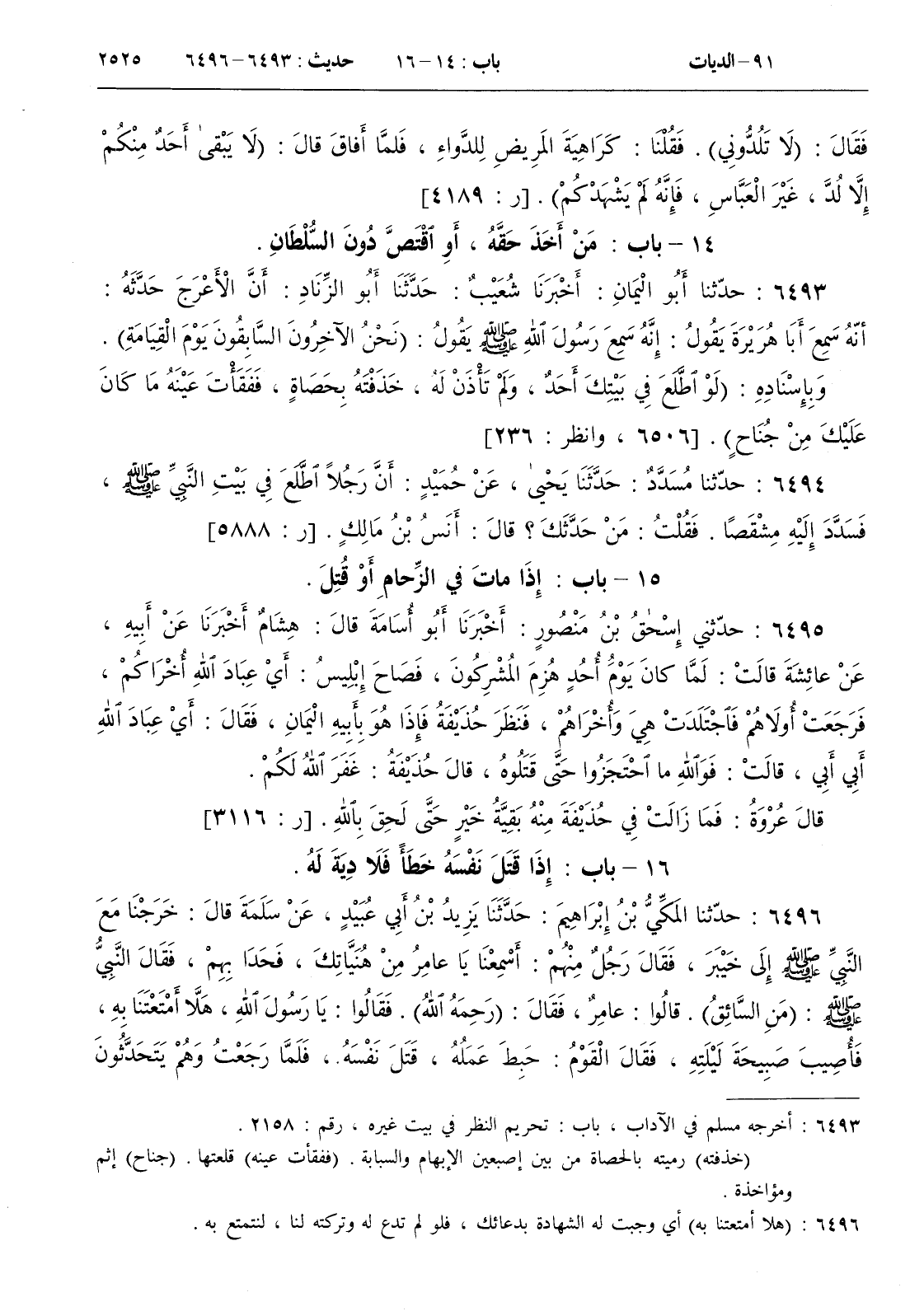 وبإسناده ( لو اطلع في بيتك أحد ولم تأذن له خذفته بحصاة ففقأت عينه ما كان عليك من جناح )