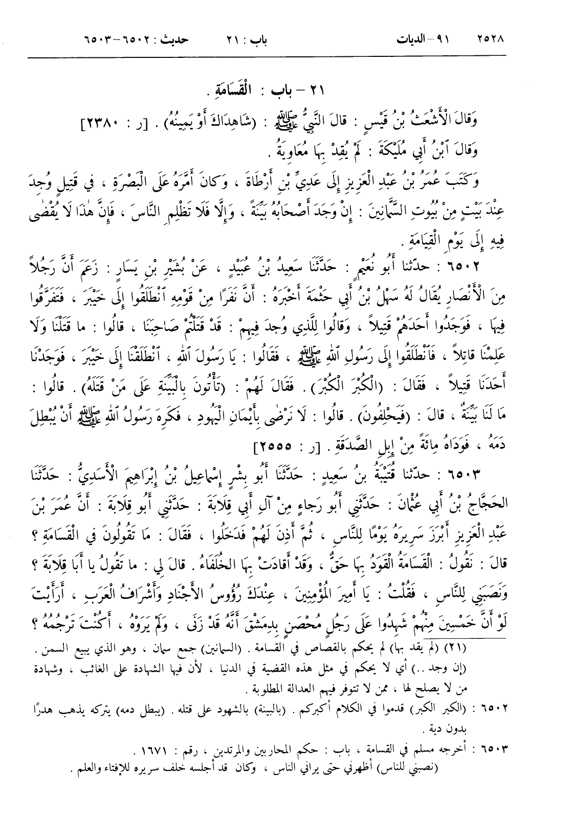 : أن عمر بن عبد العزيز أبرز سريره يوما للناس ثم أذن لهم فدخلوا فقال ما تقولون في القسامة ؟ قال نقول القسامة القود بها حق وقد أقادت بها الخلفاء . قال لي ما تقول يا أبا قلابة ؟ ونصبني للناس فقلت يا أمير المؤمنين عندك رؤوس الأجناد وأشراف العرب أرأيت لو أن خمسين منهم شهدوا على رجل محصن بدمشق أنه قد زنى ولم يروه أكنت ترجمه ؟ قال لا . قلت أرأيت لو أن خمسين منهم شهدوا على رجل بحمص أنه سرق أكنت تقطعه ولم يروه ؟ قال لا قلت فوالله ما قتل رسول الله صلى الله عليه و سلم أحدا قط إلا في إحدى ثلاث خصال رجل قتل بجريرة نفسه فقتل أو رجل زنى بعد إحصان أو رجل حارب الله ورسوله وارتد عن الإسلام . فقال القوم أو ليس قد حدث أنس بن مالك أن رسول الله صلى الله عليه و سلم قطع في السرق وسمر الأعين ثم نبذهم في الشمس ؟ فقلت أنا أحدثكم حديث أنس حدثني أنس أن نفرا من عكل ثمانية قدموا على رسول الله صلى الله عليه و سلم فبايعوه على الإسلام فاستوخموا الأرض فسقمت أجسامهم فشكوا ذلك إلى رسول الله صلى الله عليه و سلم قال ( أفلا تخرجون مع راعينا في إبله فتصيبون من ألبانها وأبوالها ) . قالوا بلى فخرجوا فشربوا من ألبانها وأبوالها فصحوا فقتلوا راعي رسول الله صلى الله عليه و سلم وأطردوا النعم فبلغ ذلك رسول الله صلى الله عليه و سلم فأرسل في آثارهم فأدركوا فجيء بهم فأمر بهم فقطعت أيديهم وأرجلهم وسمر أعينهم ثم نبذهم في الشمس حتى ماتوا قلت وأي شيء اشتد مما صنع هؤلاء ارتدوا عن الإسلام وقتلوا وسرقوا