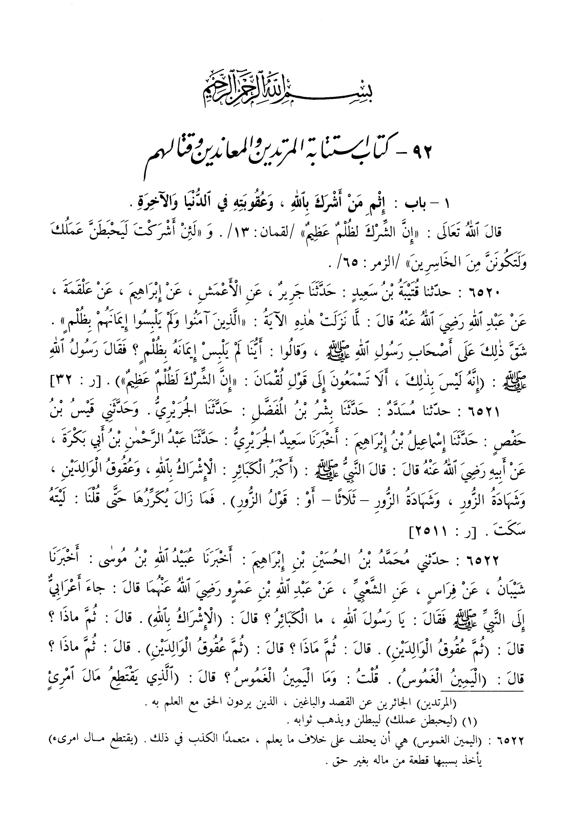 : جاء أعرابي إلى النبي صلى الله عليه و سلم فقال يا رسول الله ما الكبائر ؟ قال ( الإشراك بالله ) . قال ثم ماذا ؟ قال ( ثم عقوق الوالدين ) . قال ثم ماذا ؟ قال ( ثم عقوق الوالدين ) . قال ثم ماذا ؟ قال ( اليمين الغموس ) . قلت وما اليمين الغموس ؟ قال ( الذي يقتطع مال امرئ مسلم هو فيها كاذب )