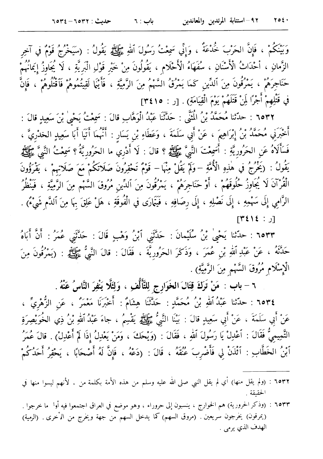 6533 - حدثنا يحيى بن سليمان حدثني ابن وهب قال حدثني عمر أن أباه حدثه عن عبد الله بن عمر وذكر الحرورية فقال