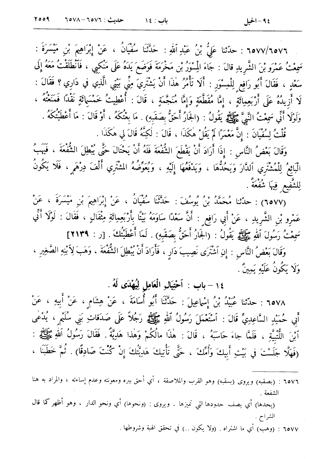 : جاء المسور بن مخرمة فوضع يده على منكبي فانطلقت معه إلى سعد فقال أبو رافع للمسور ألا تأمر هذا أن يشتري مني بيتي الذي في داري ؟ فقال لا أزيده على أربعمائة إما مقطعة وإما منجمة قال أعطيت خمسمائة نقدا فمنعته ولولا أني سمعت النبي صلى الله عليه و سلم يقول ( الجار أحق بصقبه ) . ما بعتكه أو قال ما أعطيتكه