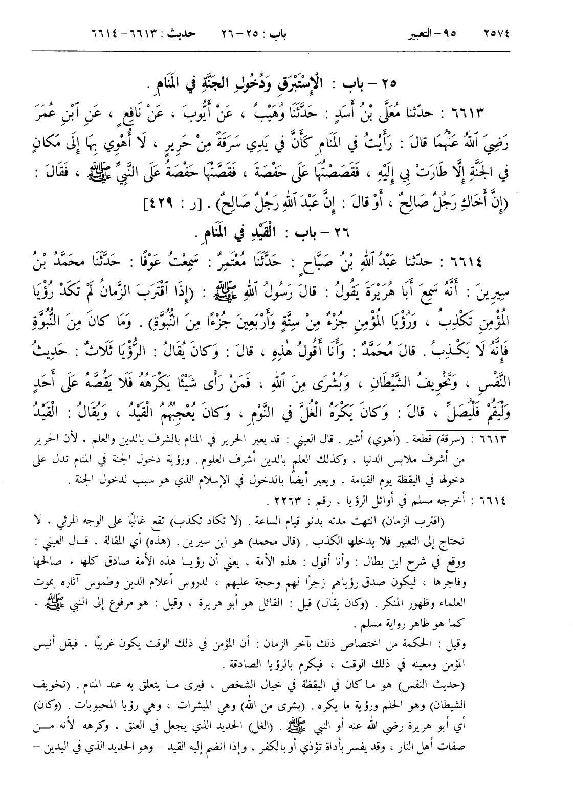 [ ش ( سرقة ) قطعة . ( أهوي ) أشير . قال العيني قد يعبر الحرير في المنام بالشرف بالدين والعلم لأن الحرير من أشرف ملابس الدنيا وكذلك العلم بالدين أشرف العلوم . ورؤية دخول الجنة في المنام تدل على دخولها في اليقظة يوم القيامة ويعبر أيضا بالدخول في الإسلام الذي هو سبب لدخول الجنة ]