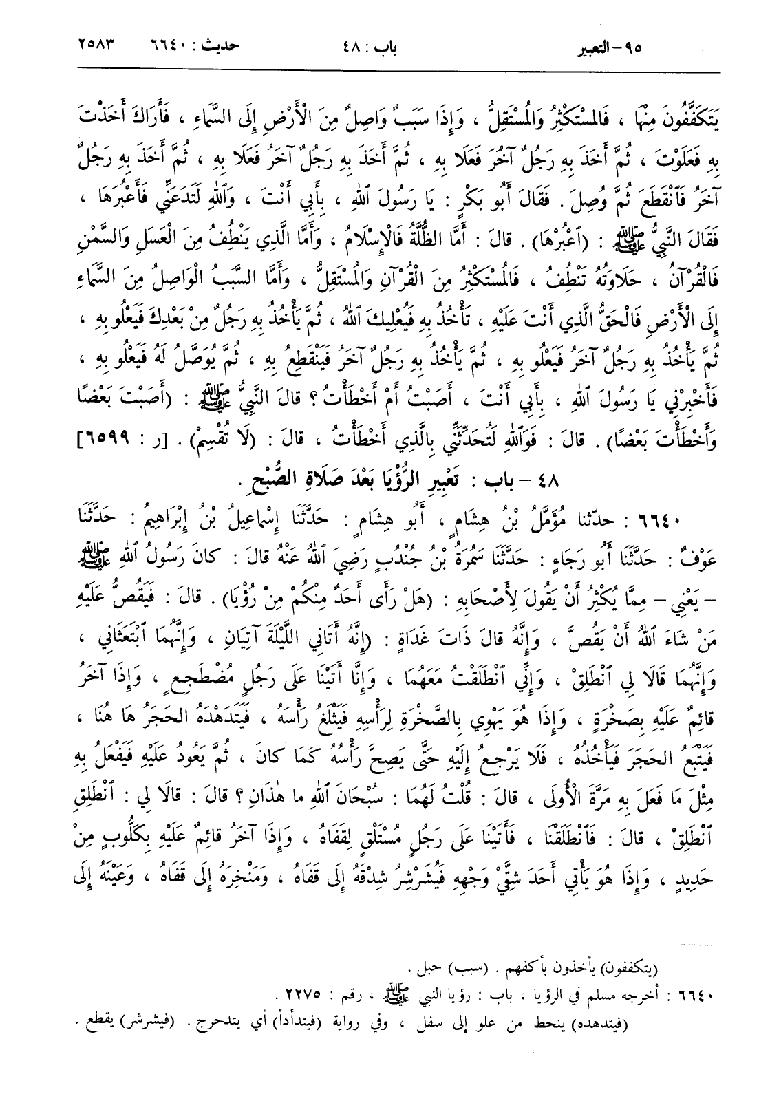 : كان رسول الله صلى الله عليه و سلم - يعني - مما يكثر أن يقول لأصحابه ( هل رأى أحد منكم من رؤيا ) . قال فيقص عليه من شاء الله أن يقص وإنه قال ذات غداة ( إنه أتاني الليلة آتيان وإنهما ابتعثاني وإنهما قالا لي انطلق وإني انطلقت معهما وإنا أتينا على رجل مضطجع وإذا آخر قائم عليه بصخرة وإذا هو يهوي بالصخرة لرأسه فيثلغ رأسه فيتدهده الحجر ها هنا فيتبع الحجر فيأخذه فلا يرجع إليه حتى يصح رأسه كما كان ثم يعود عليه فيفعل به مثل ما فعل به مرة الأولى قال قلت لهما سبحان الله ما هذان ؟ قال قالا لي انطلق انطلق قال فانطلقنا فأتينا على رجل مستلق لقفاه وإذا آخر قائم عليه بكلوب من حديد وإذا هو يأتي أحد شقي وجهه فيشرشر شدقه إلى قفاه ومنخره إلى قفاه وعينه إلى قفاه - قال وربما قال أبو رجاء فيشق - قال ثم يتحول إلى الجانب الآخر فيفعل به مثل ما فعل بالجانب الأول فما يفرغ من ذلك الجانب حتى يصح ذلك الجانب كما كان ثم يعود عليه فيفعل مثل مل فعل المرة الأولى قال قلت سبحان الله ما هذان ؟ قال قالا لي انطلق انطلق فانطلقنا فأتينا على مثل التنور - قال وأحسب أنه كان يقول - فإذا فيه لغط وأصوات قال فاطلعنا فيه فإذا فيه رجال ونساء عراة وإذا هم يأتيهم لهب من أسفل منهم فإذا أتاهم ذلك اللهب ضوضوا قال قلت لهما ما هؤلاء ؟ قال قالا لي انطلق انطلق قال فانطلقنا فأتينا على نهر - حسبت أنه كان يقول - أحمر مثل الدم وإذا في النهر رجل سابح يسبح وإذا على شط النهر رجل قد جمع عنده حجارة كثيرة وإذا ذلك السابح يسبح ما يسبح ثم يأتي ذلك الذي قد جمع عنده الحجارة فيفغر له فاه فيلقمه حجرا فينطلق يسبح ثم يرجع إليه كلما رجع إليه فغر له فاه فألقمه حجرا قال قلت لهما ما هذان ؟ قال قالا لي انطلق انطلق قال فانطلقنا فأتينا على رجل كريه المرآة كأكره ما أنت راء رجلا مرآة فإذا عنده نار يحشها ويسعى حولها قال قلت لهما ما هذا ؟ قال قالا لي انطلق انطلق فانطلقنا فأتينا على روضة معتمة فيها من كل لون الربيع وإذا بين ظهري الروضة رجل طويل لا أكاد أرى رأسه طولا في السماء وإذا حول الرجل من أكثر ولدان رأيتهم قط قال قلت لهما ما هذا ما هؤلاء ؟ قال قالا لي انطلق انطلق قال فانطلقنا فانتهينا إلى روضة عظيمة لم أر روضة قط أعظم منها ولا أحسن قال قالا لي ارق فيها قال فارتقينا فيها فانتهينا إلى مدينة مبنية بلبن ذهب ولبن فضة فأتينا باب المدينة فاستفتحنا ففتح لنا فدخلناها فتلقانا فيها رجال شطر من خلقهم كأحسن ما أنت راء وشطر كأقبح ما أنت راء قال قالا لهم اذهبوا فقعوا في ذلك النهر قال وإذا نهر معترض يجري كأن ماءه المحض في البياض فذهبوا فوقعوا فيه ثم رجعوا إلينا قد ذهب ذلك السوء عنهم فصاروا في أحسن صورة قال قالا لي هذه جنة عدن وهذاك منزلك قال فسما بصري صعدا فإذا قصر مثل الربابة البيضاء قال قالا لي هذاك منزلك قال قلت لهما بارك الله فيكما ذراني فأدخله قالا أما الآن فلا وأنت داخله قال قلت لهما فإني قد رأيت منذ الليلة عجبا فما هذا الذي رأيت ؟ قال قالا لي أما إنا سنخبرك أما الرجل الأول الذي أتيت عليه يثلغ رأسه بالحجر فإنه الرجل يأخذ القرآن فيرفضه وينام عن الصلاة المكتوبة وأما الرجل الذي أتيت عليه يشرشر شدقه إلى قفاه ومنخره إلى قفاه وعينه إلى قفاه فإنه الرجل يغدو من بيته فيكذب الكذبة تبلغ الآفاق وأما الرجال والنساء العراة الذين في مثل بناء التنور فإنهم الزناة والزواني وأما الرجل الذي أتيت عليه يسبح في النهر ويلقم الحجارة فإنه آكل الربا وأما الرجل الكريه المرآة الذي عند النار يحشها ويسعى حولها فإنه مالك خازن جهنم وأما الرجل الطويل الذي في الروضة فإنه إبراهيم صلى الله عليه و سلم وأما الولدان الذين حوله فكل مولود مات على الفطرة ) . قال فقال بعض المسلمين يا رسول الله وأولاد المشركين ؟ فقال رسول الله صلى الله عليه و سلم ( وأولاد المشركين وأما القوم الذين كانوا شطرا منهم حسن وشطرا منهم قبيح فإنهم قوم خلطوا عملا صالحا وآخر سيئا تجاوز الله عنهم )