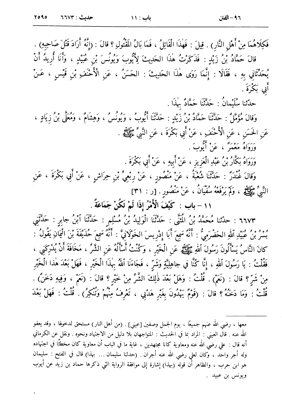 : كان الناس يسألون رسول الله صلى الله عليه و سلم عن الخير وكنت أسأله عن الشر مخافة أن يدركني فقلت يا رسول الله إنا كنا في جاهلية وشر فجاءنا الله بهذا الخير فهل بعد هذا الخير من شر ؟ قال ( نعم ) . قلت وهل بعد ذلك الشر من خير ؟ قال ( نعم وفيه دخن ) . قلت وما دخنه ؟ قال ( قوم يهدون بغير هديي تعرف منهم وتنكر ) . قلت فهل بعد ذلك الخير من شر ؟ قال ( نعم دعاة على أبواب جهنم من أجابهم إليها قذفوه فيها ) . قلت يا رسول الله صفهم لنا قال ( هم من جلدتنا ويتكلمون بألسنتنا ) . قلت فما تأمرني إن أدركني ذلك ؟ قال ( تلزم جماعة المسلمين وإمامهم ) . قلت فإن لم يكن لهم جماعة ولا إمام ؟ قال ( فاعتزل تلك الفرق كلها ولو أن تعض بأصل شجرة حتى يدركك الموت وأنت على ذلك )