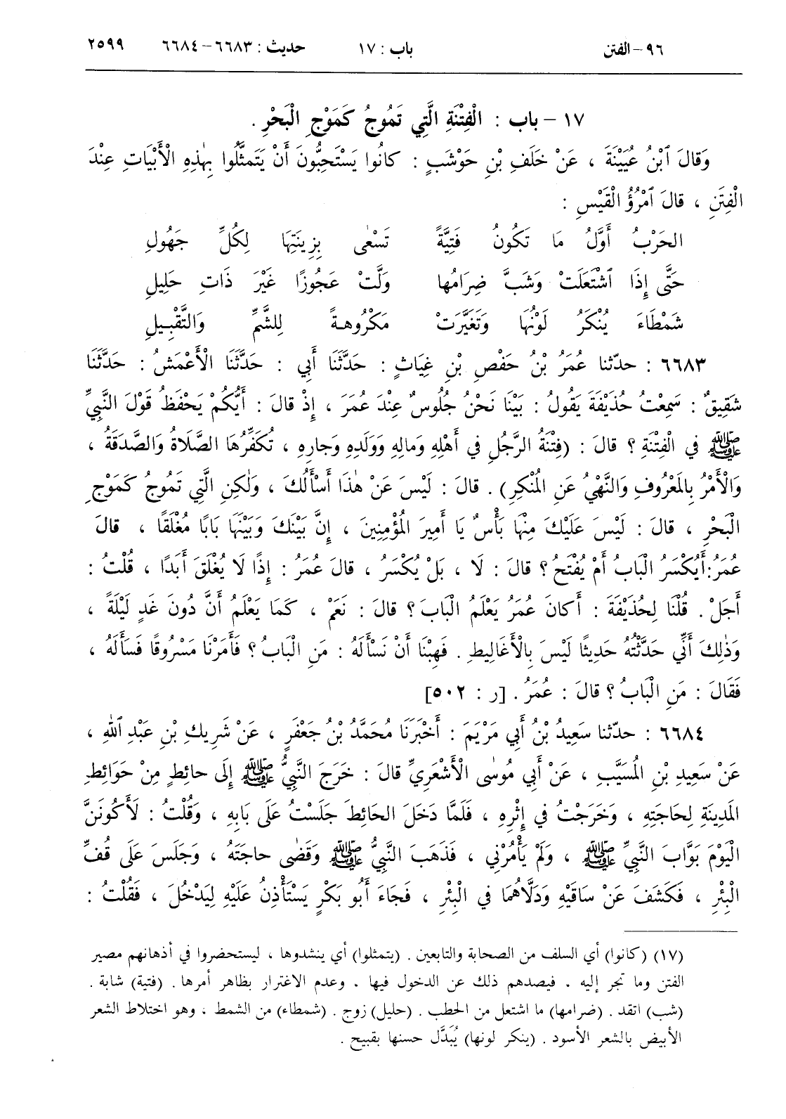 : بينا نحن جلوس عند عمر إذ قال أيكم يحفظ قول النبي صلى الله عليه و سلم في الفتنة ؟ قال ( فتنة الرجل في أهله وماله وولده وجاره تكفرها الصلاة والصدقة والأمر بالمعروف والنهي عن المنكر ) . قال ليس عن هذا أسألك ولكن التي تموج كموج البحر قال ليس عليك منها بأس يا أمير المؤمنين إن بينك وبينها بابا مغلقا قال عمر أيكسر الباب أم يفتح ؟ قال لا بل يكسر قال عمر إذا لا يغلق أبدا قلت أجل . قلنا لحذيفة أكان عمر يعلم الباب ؟ قال نعم كما يعلم أن دون غد ليلة وذلك أني حدثته حديثا ليس بالأغاليط . فهبنا أن نسأله من الباب ؟ فأمرنا مسروقا فسأله فقال من الباب ؟ قال عمر