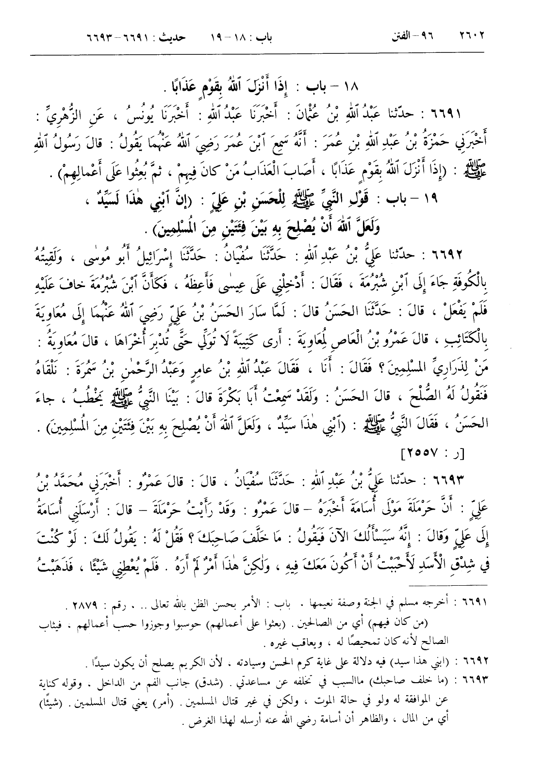 [ ش ( ابني هذا سيد ) فيه دلالة على غاية كرم الحسن وسيادته لأن الكريم يصلح أن يكون سيدا ]