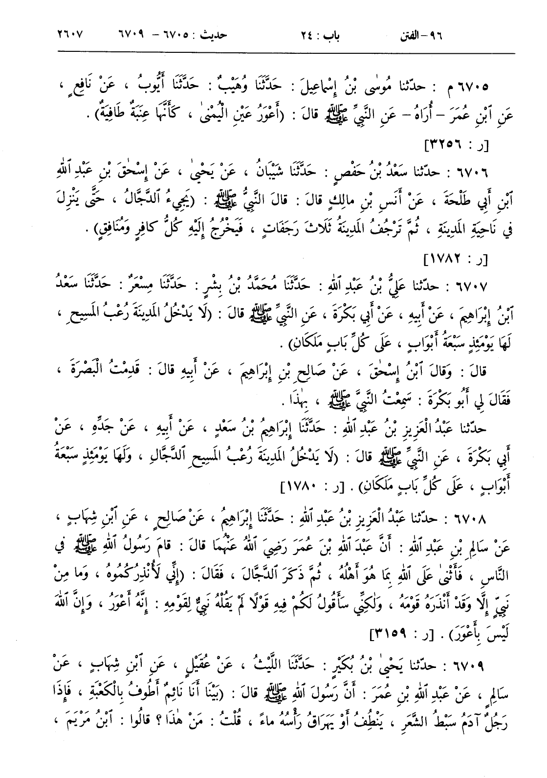 حدثنا عبد العزيز بن عبد الله حدثنا إبراهيم بن سعد عن أبيه عن جده عن أبي بكرة عن النبي صلى الله عليه و سلم قال ( لا يدخل المدينة رعب المسيح الدجال ولها يومئذ سبعة أبواب على كل باب ملكان )
