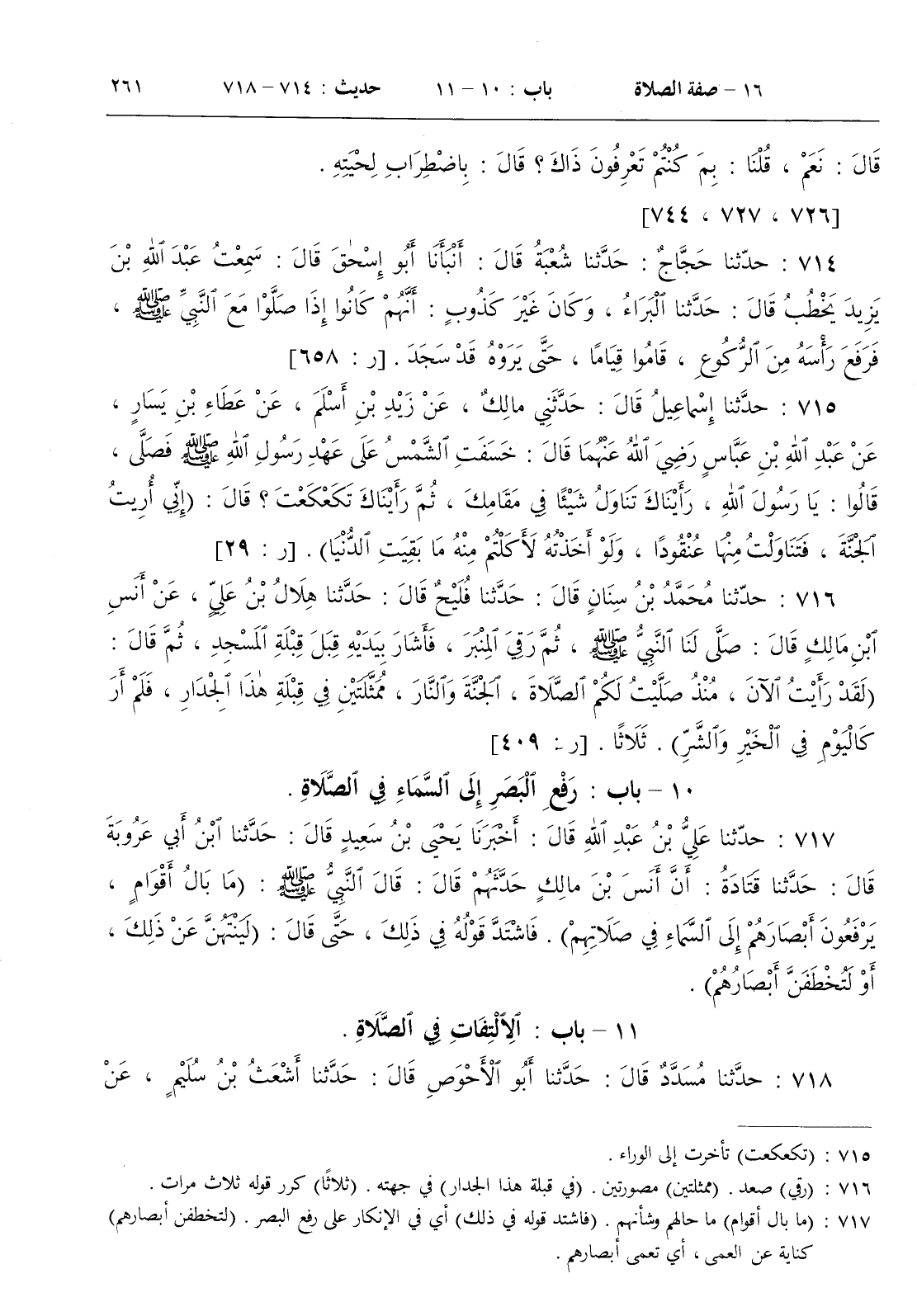 717 - حدثناعلي بن عبد الله قال أخبرنا يحيى بن سعيد قال حدثنا ابن أبي عروبة قال حدثنا قتادة أن أنس بن مالك حدثهم قال قال النبي صلى الله عليه و سلم