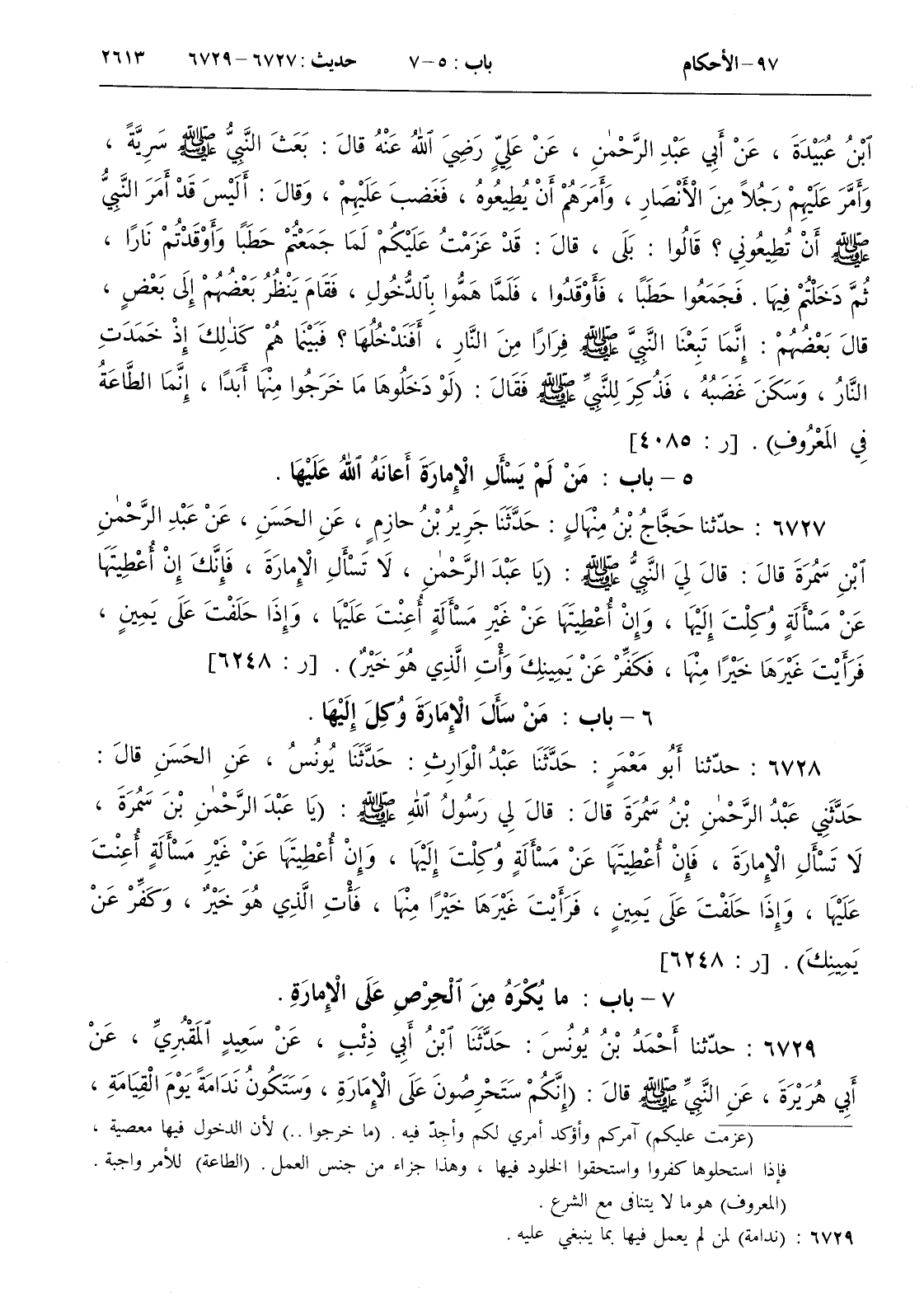 : قال لي النبي صلى الله عليه و سلم ( يا عبد الرحمن لا تسأل الإمارة فإنك إن أعطيتها عن مسألة وكلت إليها وإن أعطيتها عن غير مسألة أعنت عليها وإذا حلفت على يمين فرأيت غيرها خيرا منها فكفر عن يمينك وأت الذي هو خير )