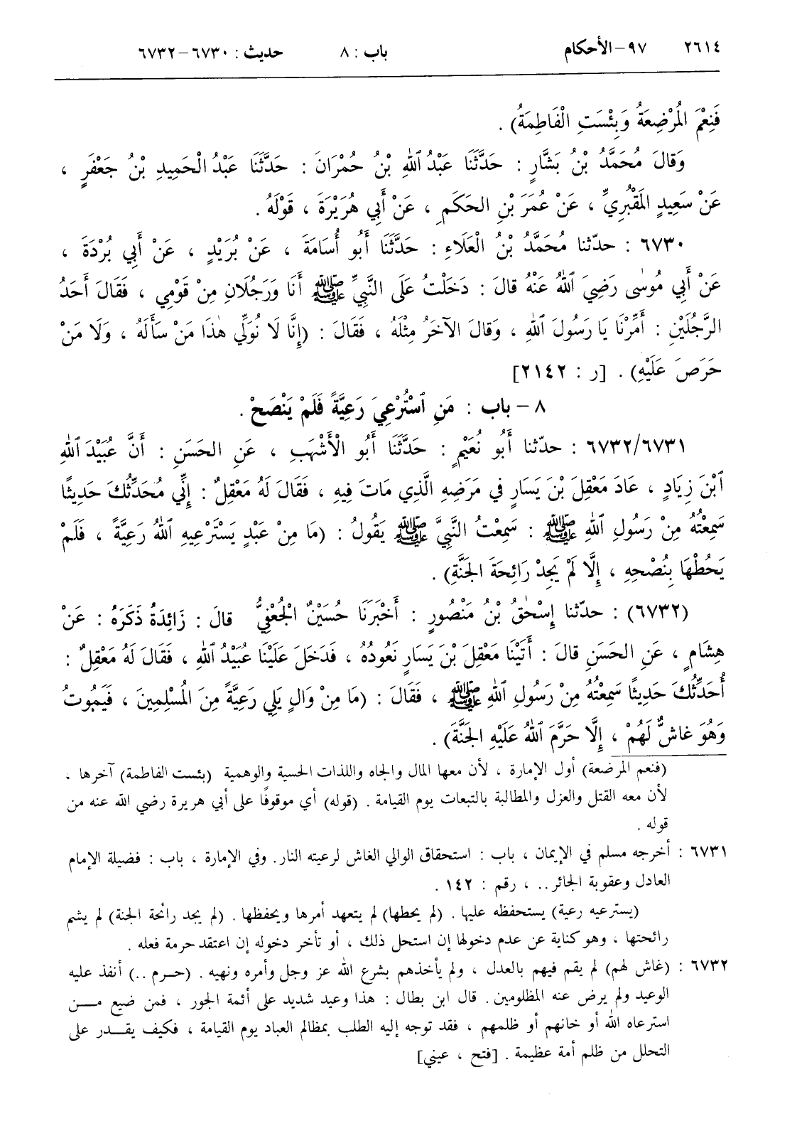 : فقال ( ما من وال يلي رعية من المسلمين فيموت وهو غاش لهم إلا حرم الله عليه الجنة )