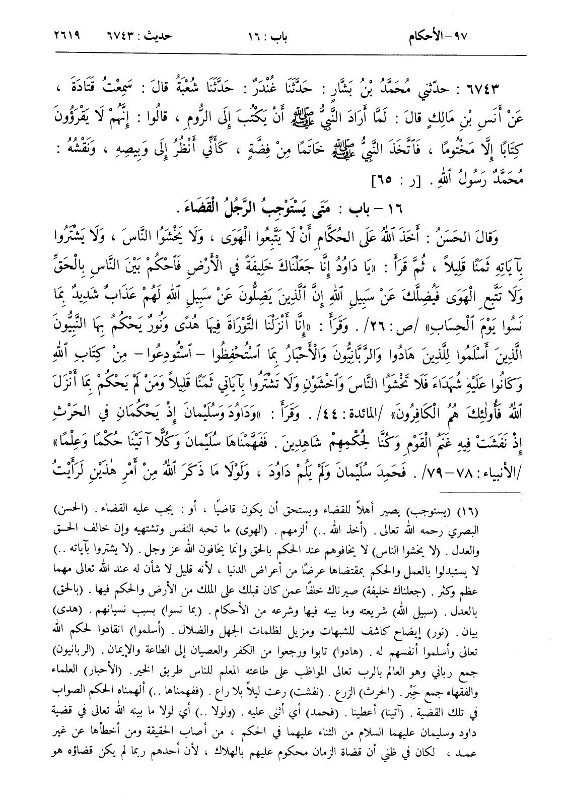 وقال الحسن أخذ الله على الحكام أن لا يتبعوا الهوى ولا يخشوا الناس ولا يشتروا بآياته ثمنا قليلا ثم قرأ { يا داود إنا جعلناك خليفة في الأرض فاحكم بين الناس بالحق ولا تتبع الهوى فيضلك عن سبيل الله إن الذين يضلون عن سبيل الله لهم عذاب شديد بما نسوا يوم الحساب } / ص 26 / . وقرأ { إنا أنزلنا التوارة فيها هدى ونور يحكم بها النبيون الذين أسلموا للذين هادوا والربانيون والأحبار بما استحفظوا - استودعوا - من كتاب الله وكانوا عليه شهداء فلا تخشوا الناس واخشون ولا تشتروا بآياتي ثمنا قليلا ومن لم يحكم بما أنزل الله فأولئك هم الكافرون } / المائدة 44 / . وقرأ { وداود وسليمان إذ يحكمان في الحرث إذ نفشت فيه غنم القوم وكنا لحكمهم شاهدين . ففهمناها سليمان وكلا آتينا حكما وعلما } / الأنبياء 78 - 79 / . فحمد سليمان ولم يلم داود ولولا ما ذكر الله من أمر هذين لرأيت أن القضاة هلكوا فإنه أثنى على هذا بعلمه وعذر هذا باجتهاده