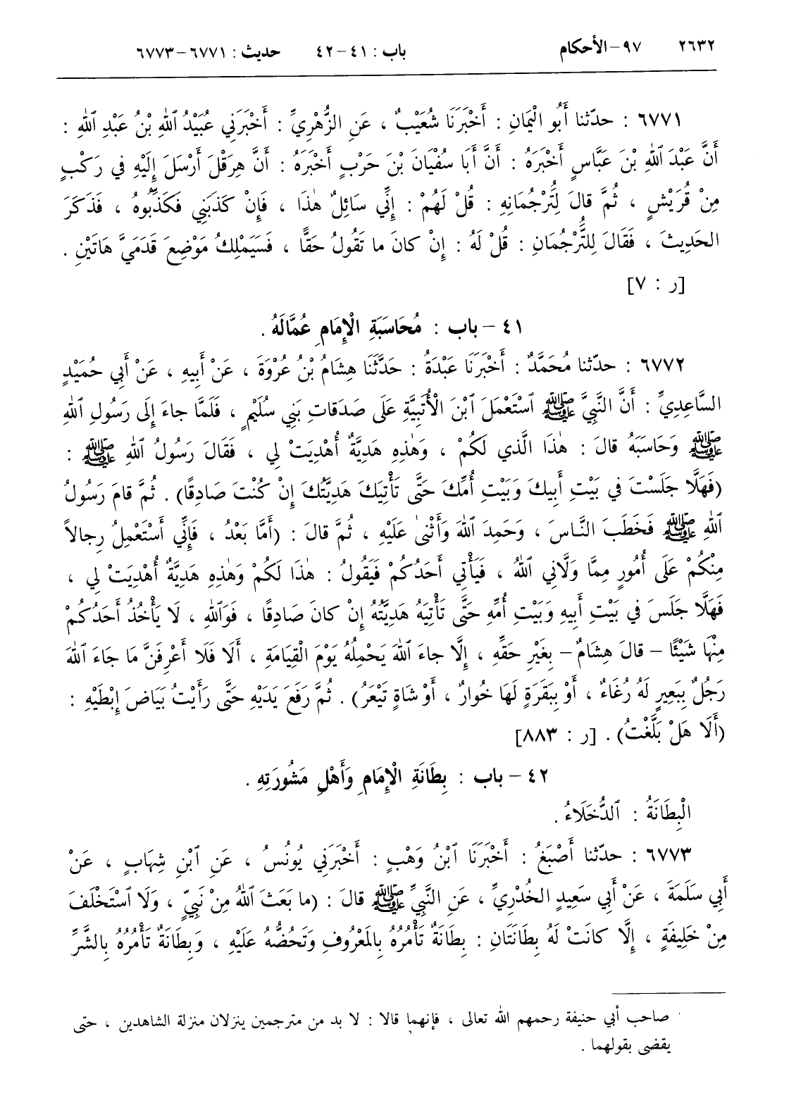 : أن النبي صلى الله عليه و سلم استعمل ابن الأتبية على صدقات بني سليم فلما جاء إلى رسول الله صلى الله عليه و سلم وحاسبه قال هذا الذي لكم وهذه هدية أهديت لي فقال رسول الله صلى الله عليه و سلم ( فهلا جلست في بيت أبيك وبيت أمك حتى تأتيك هديتك إن كنت صادقا ) . ثم قام رسول الله صلى الله عليه و سلم فخطب الناس وحمد الله وأثنى عليه ثم قال ( أما بعد فإني أستعمل رجالا منكم على أمور مما ولاني الله فيأتي أحدكم فيقول هذا لكم وهذه هدية أهديت لي فهلا جلس في بيت أبيه وبيت أمه حتى تأتيه هديته إن كان صادقا فوالله لا يأخذ أحدكم منها شيئا - قال هشام - بغير حقه إلا جاء الله يحمله يوم القيامة ألا فلا أعرفن ما جاء الله رجل ببعير له رغاء أو ببقرة لها خوار أو شاة تيعر ) . ثم رفع يديه حتى رأيت بياض إبطيه ( ألا هل بلغت )