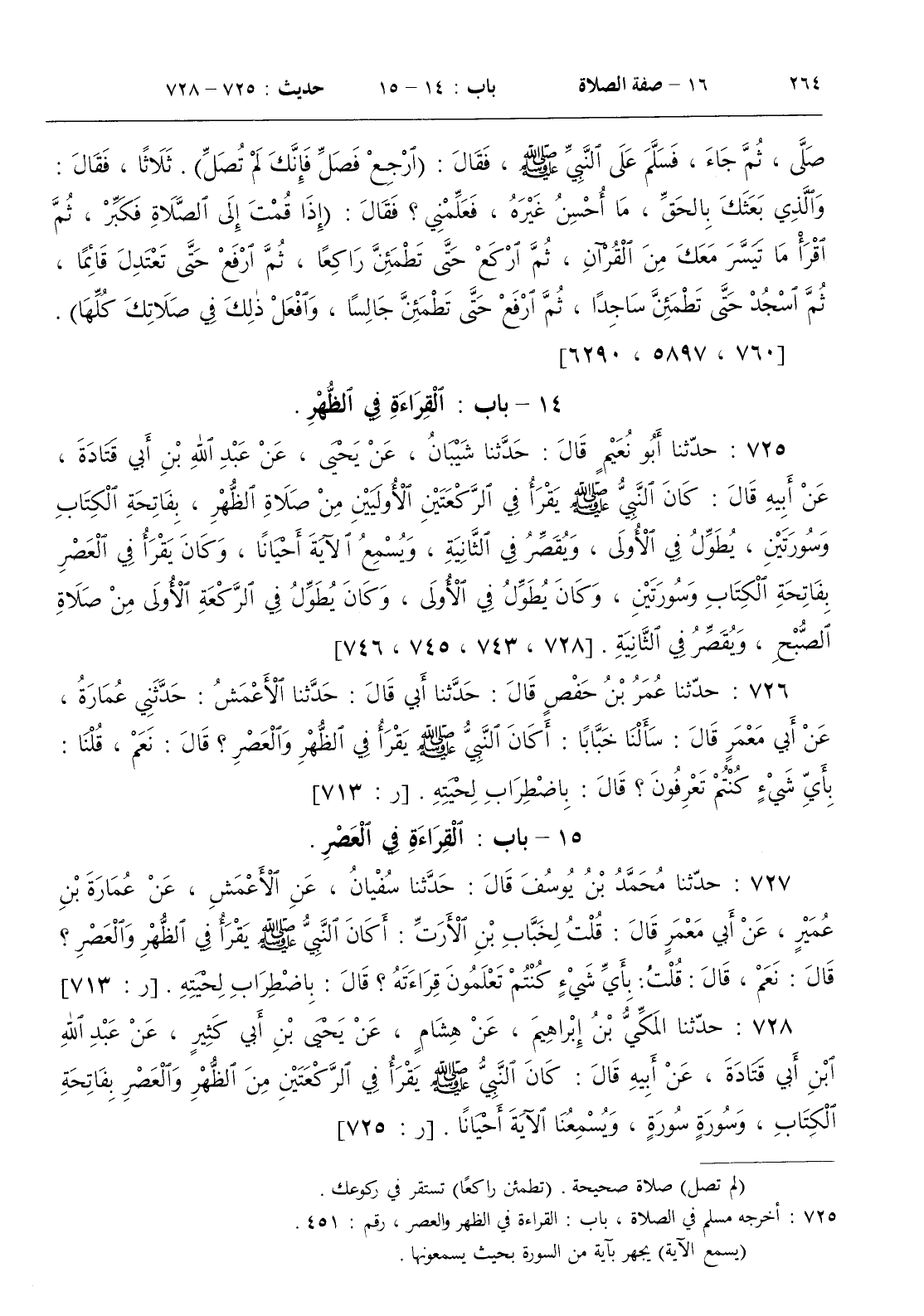 : كان النبي صلى الله عليه و سلم يقرأ في الركعتين الأوليين من صلاة الظهر بفاتحة الكتاب وسورتين يطول في الأولى ويقصر في الثانية ويسمع الآية أحيانا وكان يقرأ في العصر بفاتحة الكتاب وسورتين وكان يطول في الأولى وكان يطول في الركعة الأولى من صلاة الصبح ويقصر في الثانية
