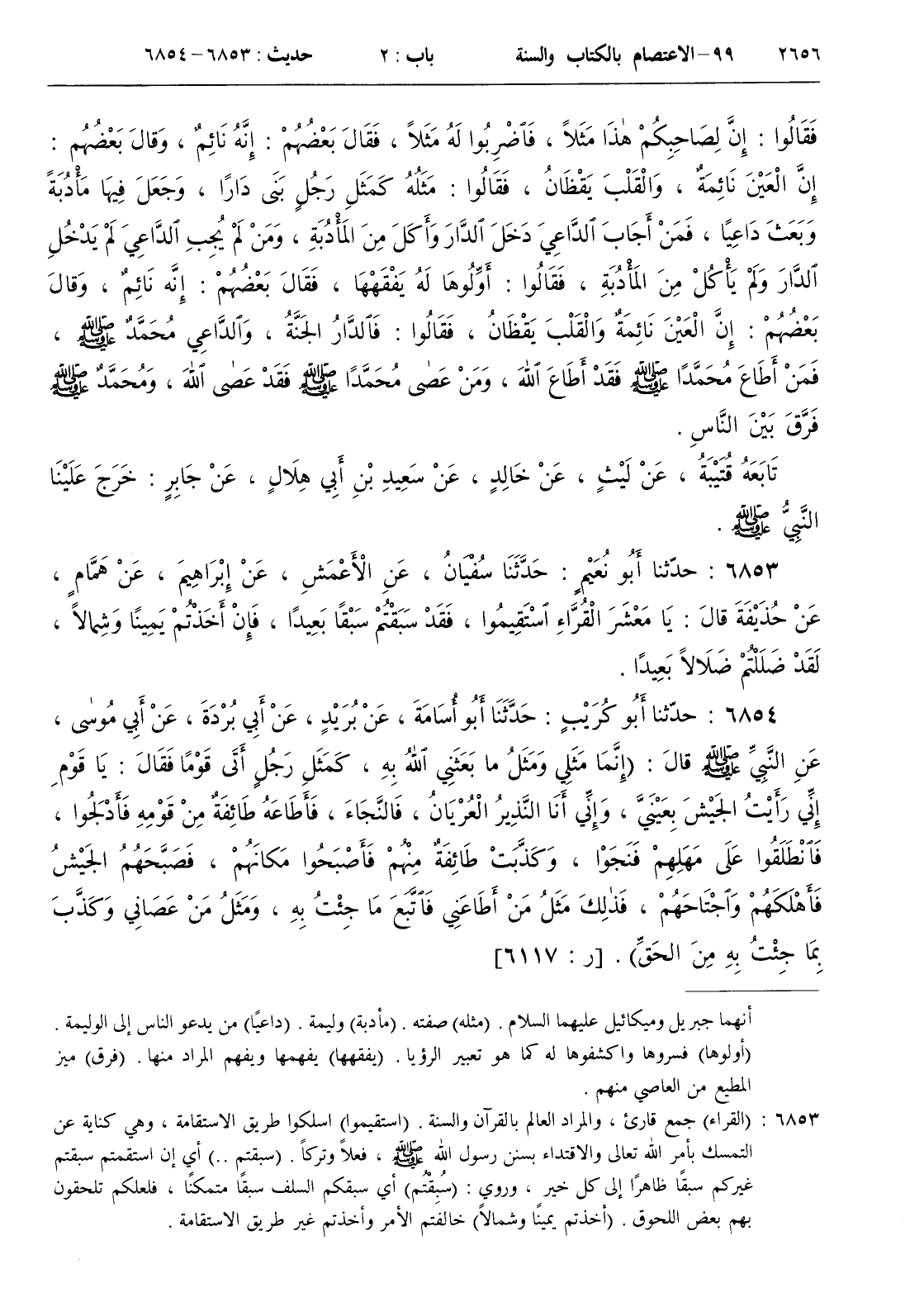 6853 - حدثنا أبو نعيم حدثنا سفيان عن الأعمش عن إبراهيم عن همام عن حذيفة قال يا معشر القراء استقيموا فقد سبقتم سبقا بعيدا فإن أخذتم يمينا وشمالا لقد ضللتم ضلالا بعيدا