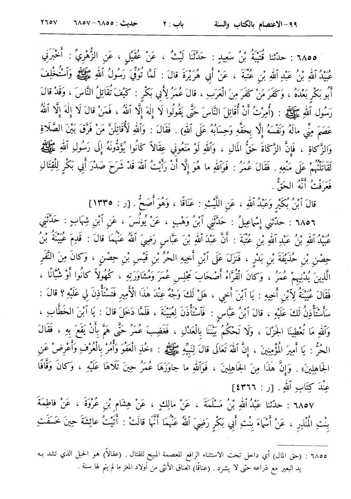 [ ش ( حق المال ) أي داخل تحت الاستثناء الرافع للعصمة المبيح للقتال . ( عقالا ) هو الحبل الذي تشد به يد البعير مع ذراعه حتى لا يشرد . ( عناقا ) العناق الأنثى من أولاد المعز ما لم يتم لها سنة ]