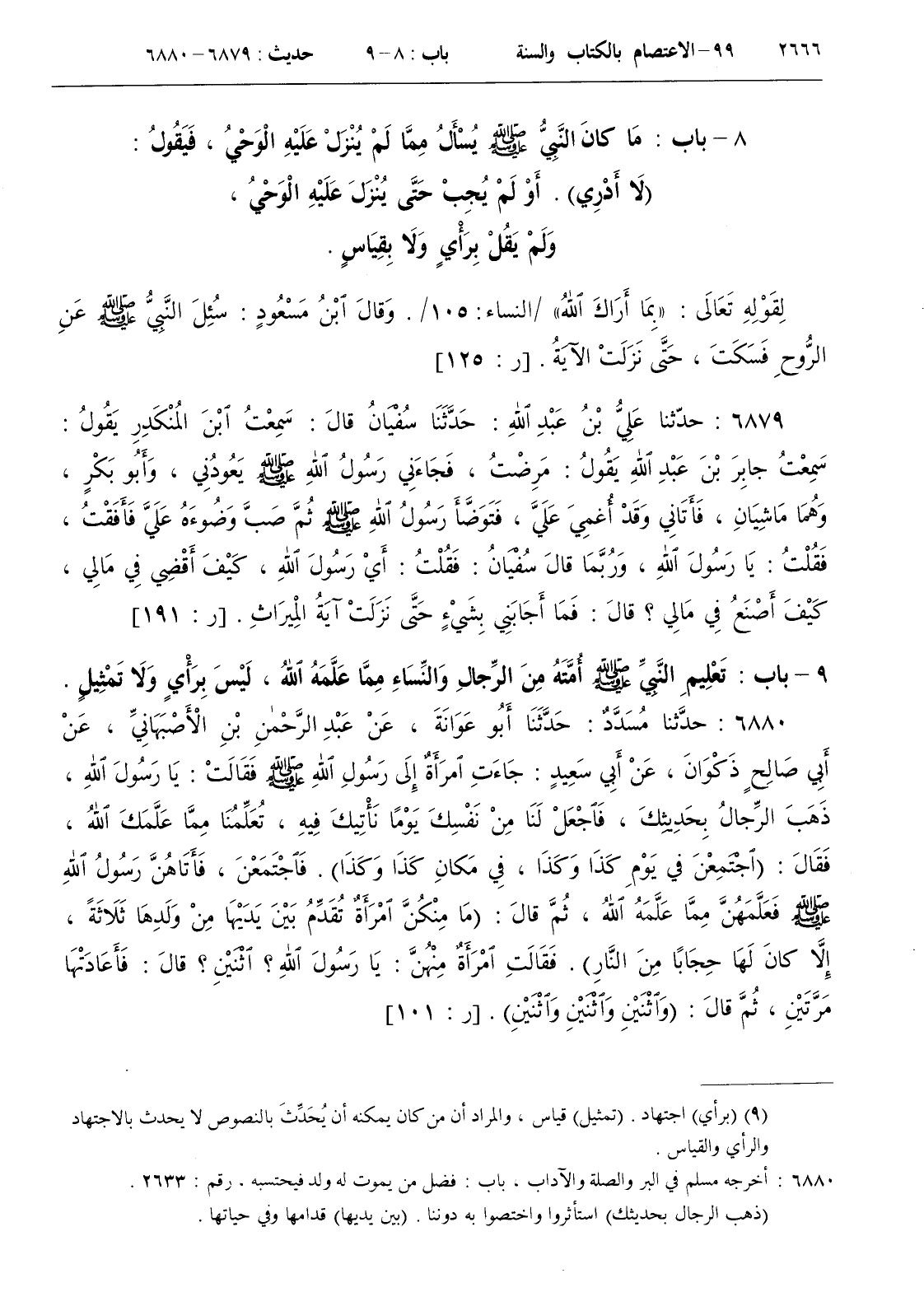9 - باب تعليم النبي صلى الله عليه و سلم أمته من الرجال والنساء مما علمه الله ليس برأي ولا تمثيل