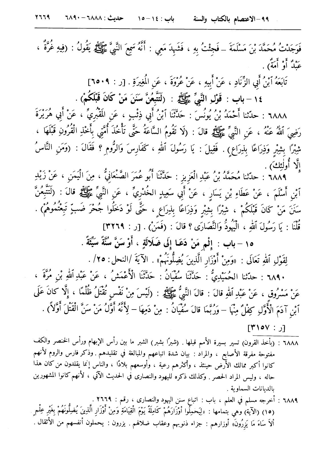 [ ش ( بأخذ القرون ) تسير بسيرة الأمم قبلها . ( شبرا بشبر ) الشبر ما بين رأس الإبهام ورأس الخنصر والكف مفتوحة مفرقة الأصابع والمراد بيان شدة اتباعهم والمبالغة في تقليدهم . وذكر فارس والروم لأنهم كانوا أكبر ممالك الأرض حينئذ وأكثرهم رعية وأوسعهم بلادا والناس إنما يقلدون من كان هذا حاله وليس المراد الحصر . وكذلك ذكره لليهود والنصارى في الحديث الآتي لأنهم كانوا المشهورين بالديانات السماوية ]