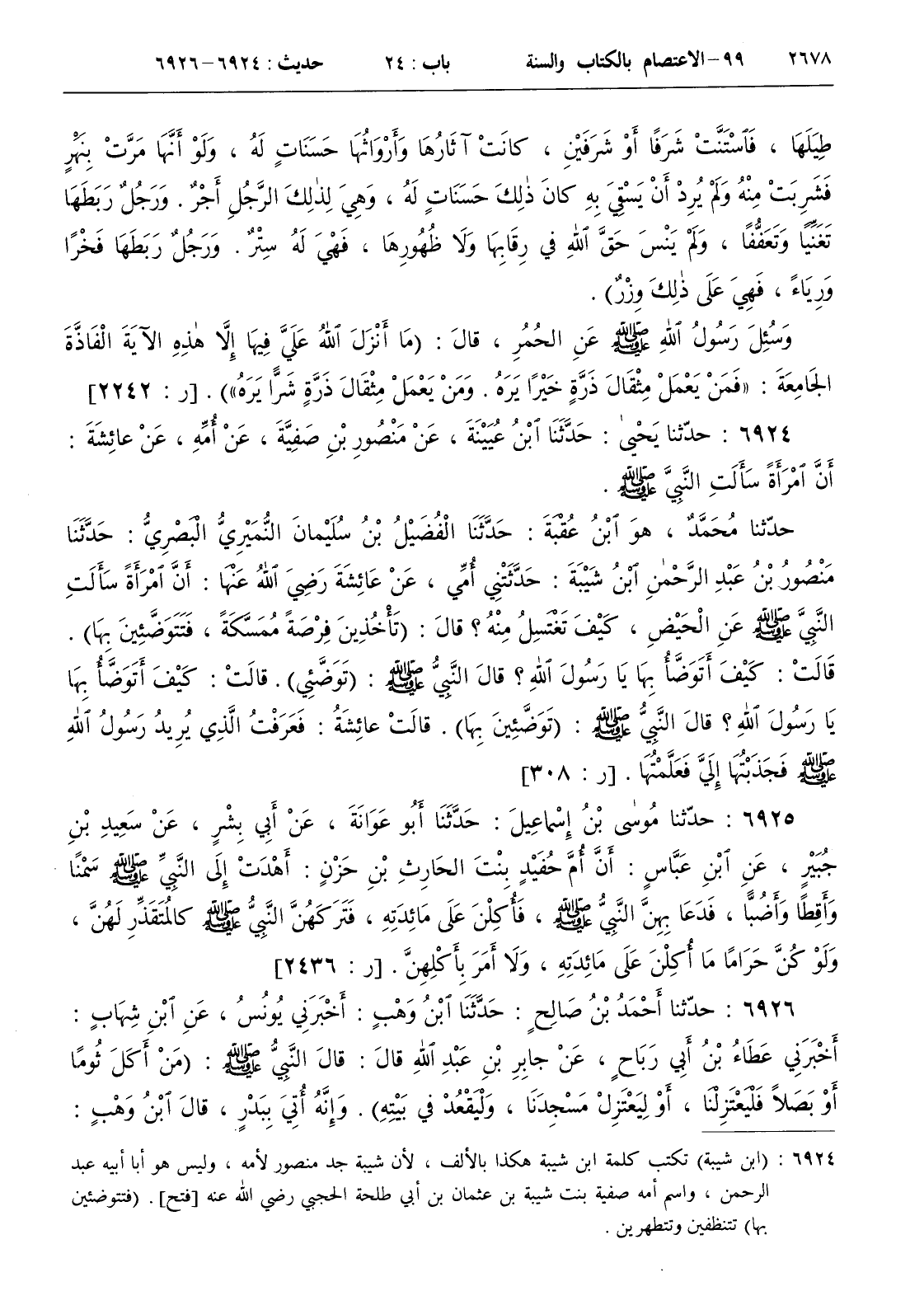 [ ش ( ابن شيبة ) تكتب كلمة ابن شيبة هكذا بالألف لأن شيبة جد منصور لأمه وليس هو أبا أبيه عبد الرحمن واسم أمه صفية بنت شيبة بن عثمان بن أبي طلحة الحجبي رضي الله عنه [ فتح ] . ( فتتوضئين بها ) تتنظفين وتتطهرين ]