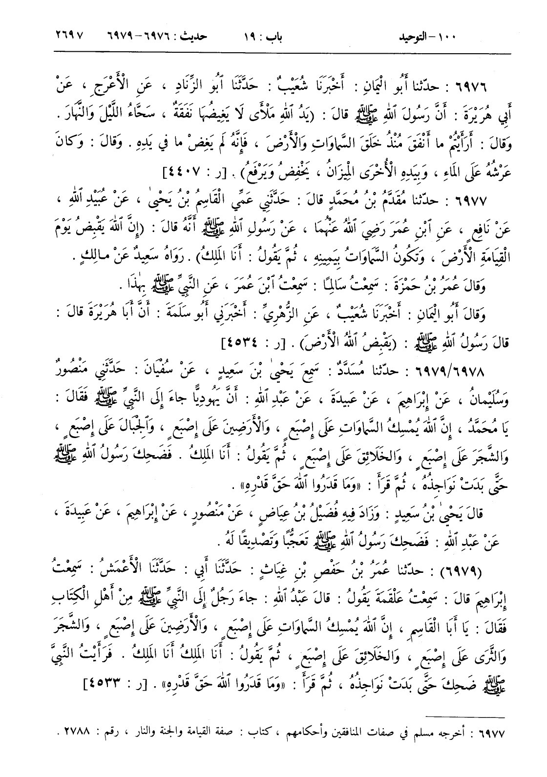 : عن رسول الله صلى الله عليه و سلم أنه قال ( إن الله يقبض يوم القيامة الأرض وتكون السماوات بيمينه ثم يقول أنا الملك ) . رواه سعيد عن مالك