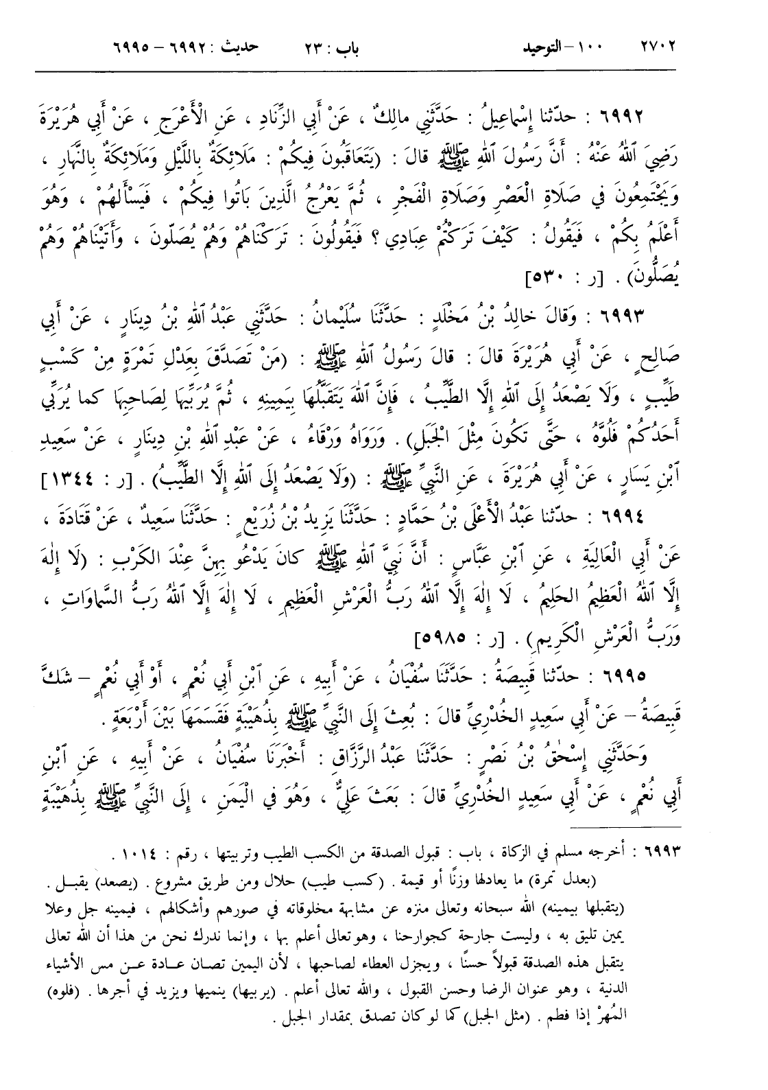 : قال رسول الله صلى الله عليه و سلم ( من تصدق بعدل تمرة من كسب طيب ولا يصعد إلى الله إلا الطيب فإن الله يتقبلها بيمينه ثم يربيها لصاحبها كما يربي أحدكم فلوه حتى تكون مثل الجبل ) . ورواه ورقاء عن عبد الله بن دينار عن سعيد بن يسار عن أبي هريرة عن النبي صلى الله عليه و سلم ( ولا يصعد إلى الله إلا الطيب )