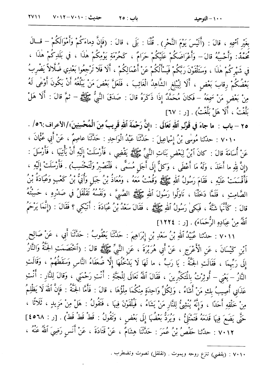 : كان ابن لبعض بنات النبي صلى الله عليه و سلم يقضي فأرسلت إليه أن يأتيها فأرسل ( إن لله ما أخذ وله ما أعطى وكل إلى أجل مسمى فلتصبر ولتحتسب ) . فأرسلت إليه فأقسمت عليه فقام رسول الله صلى الله عليه و سلم وقمت معه ومعاذ بن جبل وأبي بن كعب وعبادة بن الصامت فلما دخلنا ناولوا رسول الله صلى الله عليه و سلم الصبي ونفسه تقلقل في صدره حسبته قال كأنها شنة فبكى رسول الله صلى الله عليه و سلم فقال سعد بن عبادة أتبكي ؟ فقال ( إنما يرحم الله من عباده الرحماء ) . [ ر 1224 ]