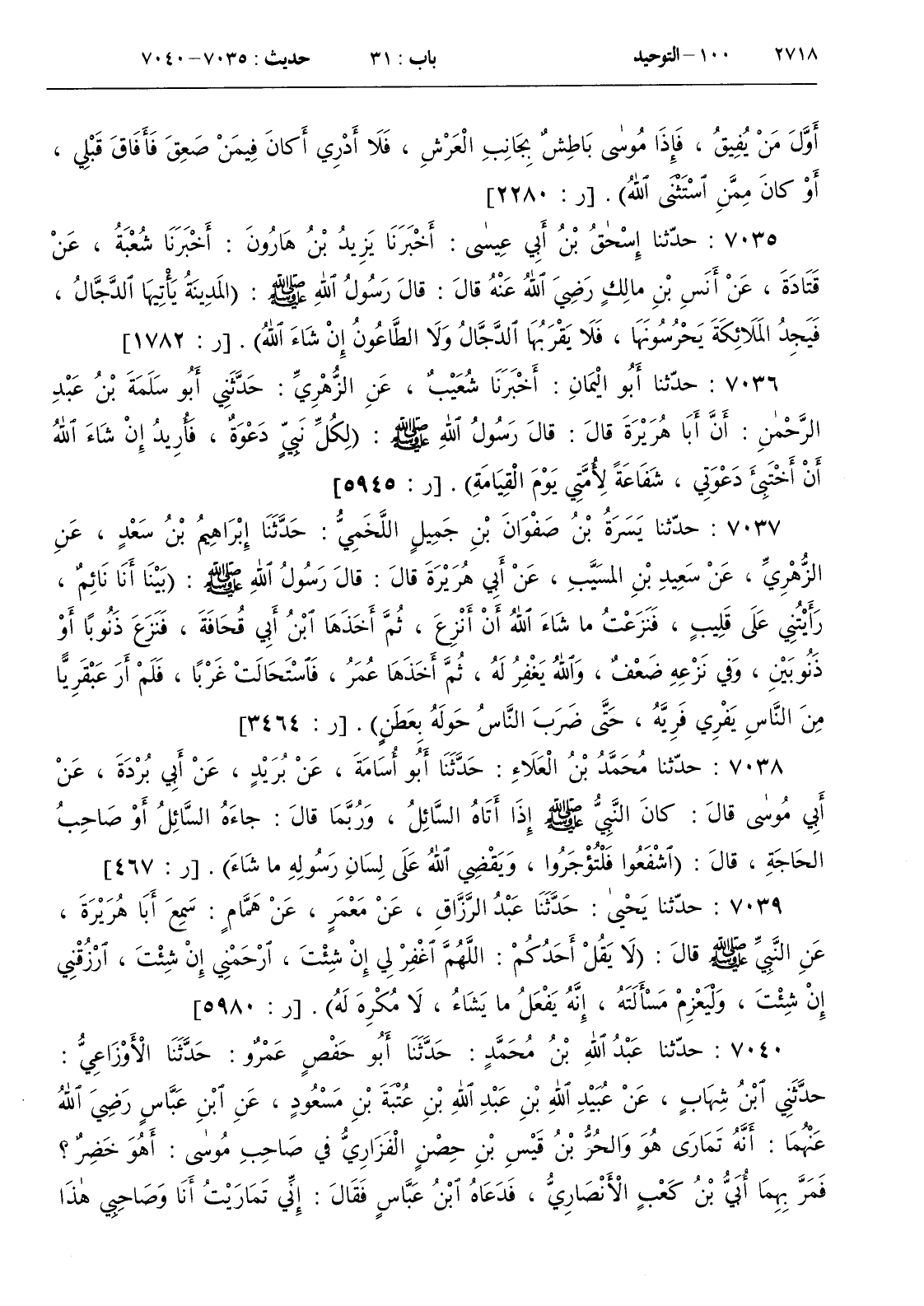 7035 - حدثنا إسحق بن أبي عيسى أخبرنا يزيد بن هارون أخبرنا شعبة عن قتادة عن أنس بن مالك رضي الله عنه قال