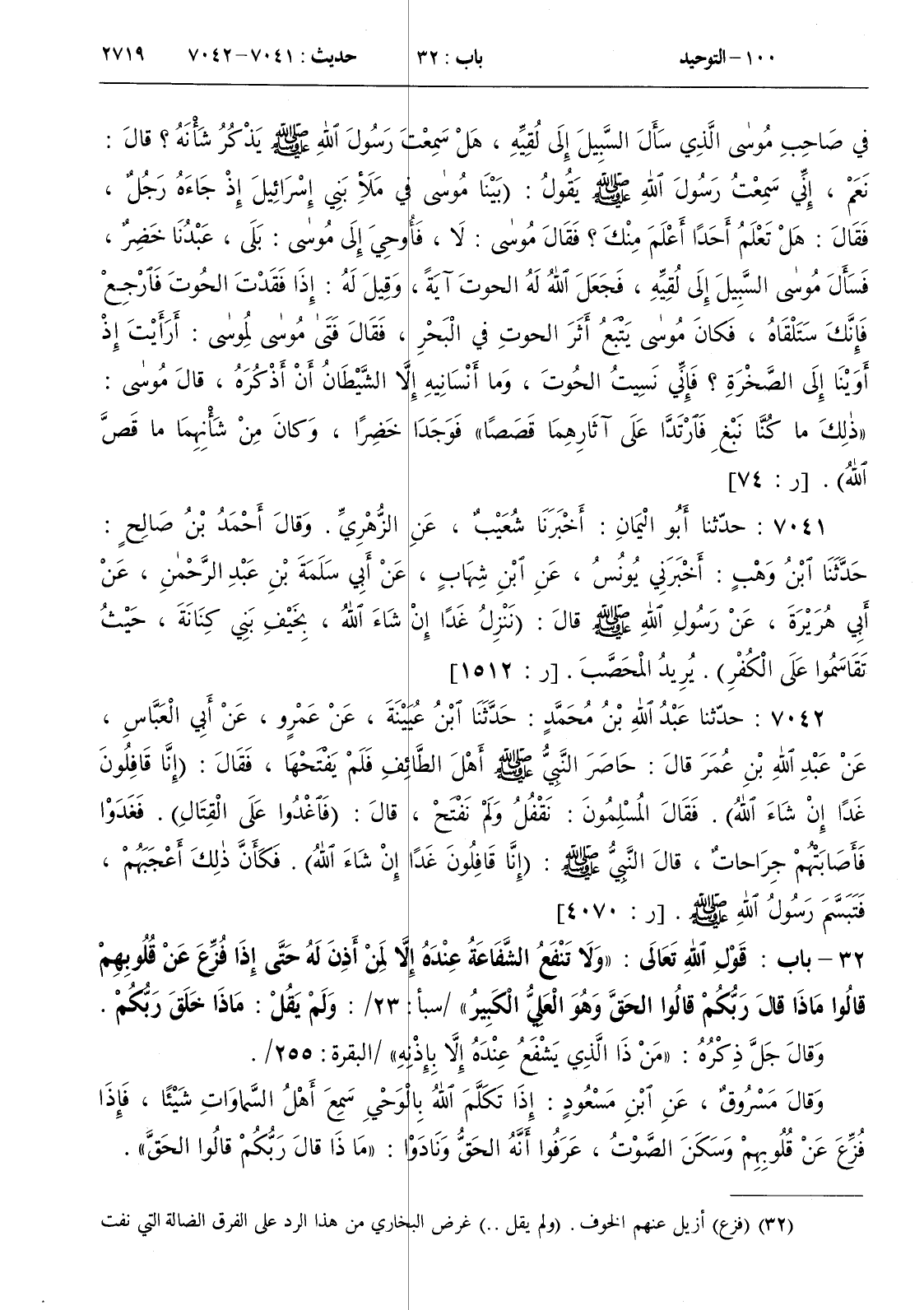 32 - باب قول الله تعالى { ولا تنفع الشفاعة عنده إلا لمن أذن له حتى إذا فزع عن قلوبهم قالوا ماذا قال ربكم قالوا الحق وهو العلي الكبير } / سبأ 23 / ولم يقل ماذا خلق ربكم
