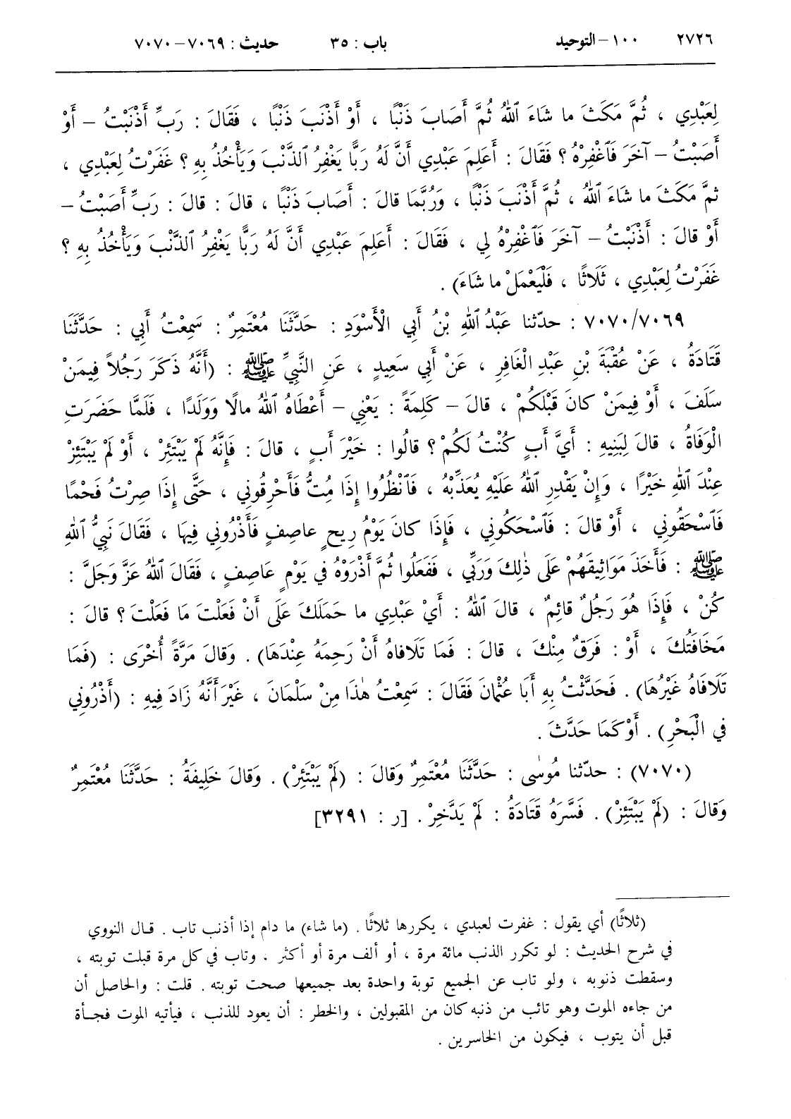 : عن النبي صلى الله عليه و سلم ( أنه ذكر رجلا فيمن سلف أو فيمن كان قبلكم قال - كلمة يعني - أعطاه الله مالا وولدا فلما حضرت الوفاة قال لبنيه أي أب كنت لكم ؟ قالوا خير أب قال فإنه لم يبتئر أو لم يبتئز عند الله خيرا وإن يقدر الله عليه يعذبه فانظروا إذا مت فأحرقوني حتى إذا صرت فحما فاسحقوني أو قال فاسحكوني فإذا كان يوم ريح عاصف فأذروني فيها فقال نبي الله صلى الله عليه و سلم فأخذ مواثيقهم على ذلك وربي ففعلوا ثم أذروه في يوم عاصف فقال الله عز و جل كن فإذا هو رجل قائم قال الله أي عبدي ما حملك على أن فعلت ما فعلت ؟ قال مخافتك أو فرق منك قال فما تلافاه أن رحمه عندها ) . وقال مرة أخرى ( فما تلافاه غيرها ) . فحدثت به أبا عثمان فقال سمعت هذا من سلمان غير أنه زاد فيه ( أذروني في البحر ) . أو كما حدث