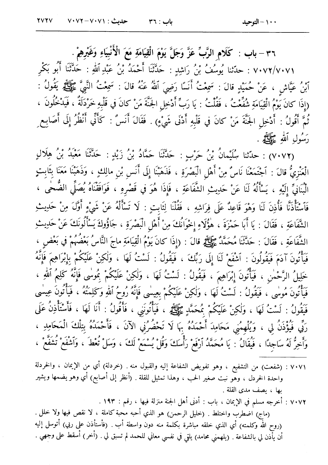 7072 - حدثنا سليمان بن حرب حدثنا حماد بن زيد حدثنا معبد بن هلال العنزي قال اجتمعنا ناس من أهل البصرة فذهبنا إلى أنس بن مالك وذهبنا معنا بثابت البناني إليه يسأله لنا عن حديث الشفاعة فإذا هو في قصره فوافقناه يصلي الضحى فاستأذنا فأذن لنا وهو قاعد على فراشه فقلنا لثابت لا تسأله عن شيء أول من حديث الشفاعة فقال يا أبا حمزة هؤلاء إخوانك من أهل البصرة جاؤوك يسألونك عن حديث الشفاعة فقال