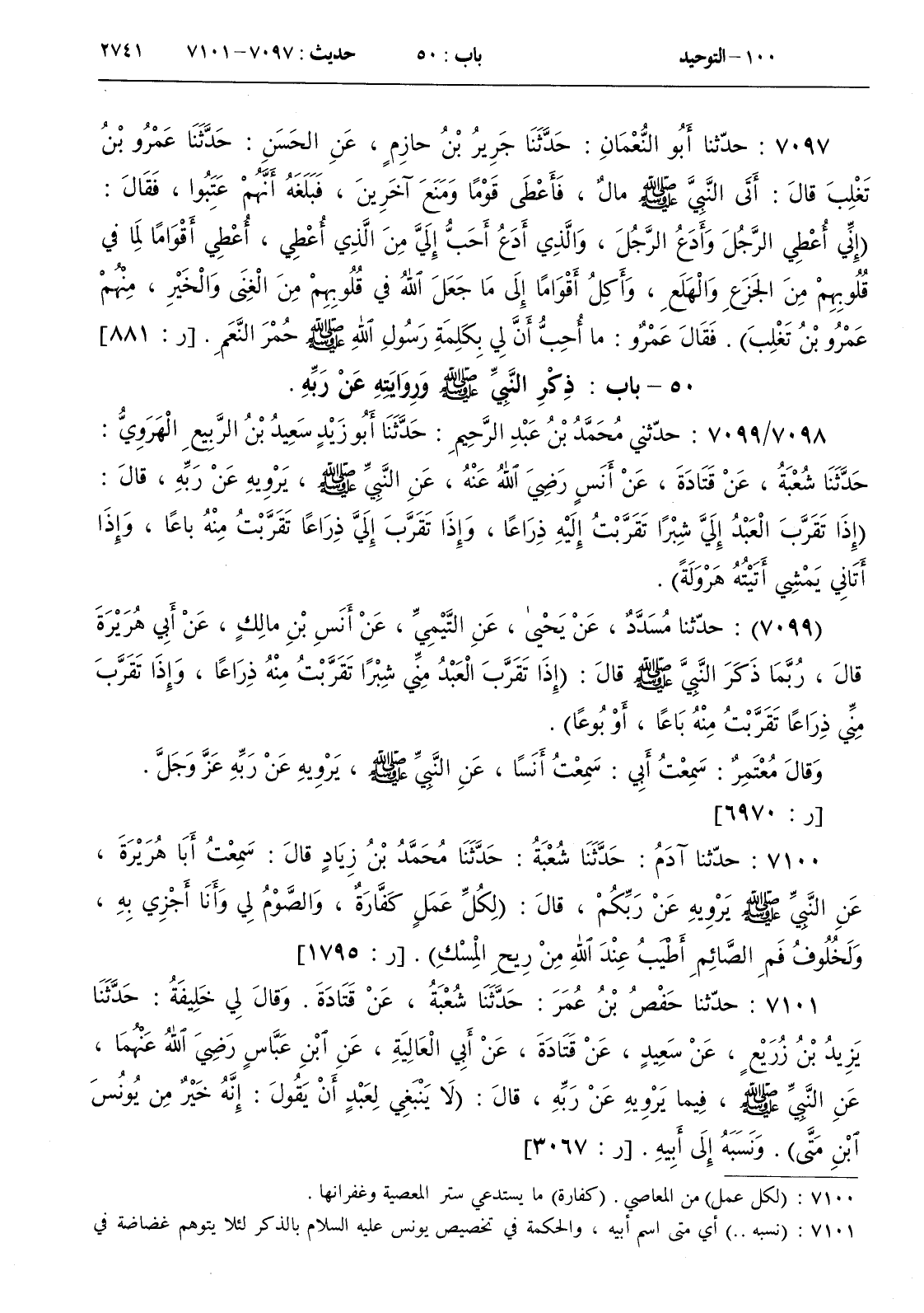: عن النبي صلى الله عليه و سلم يرويه عن ربه قال ( إذا تقرب العبد إلي شبرا تقربت إليه ذراعا وإذا تقرب إلي ذراعا تقربت منه باعا وإذا أتاني يمشي أتيته هرولة )