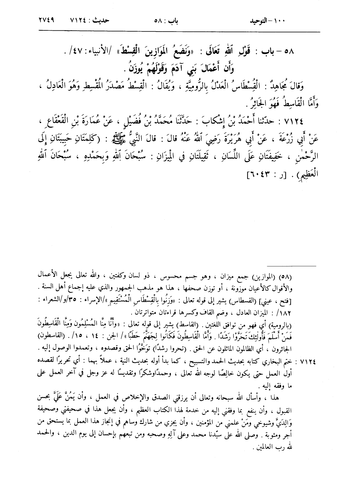 [ ش ختم البخاري كتابه بحديث الحمد والتسبيح كما بدأ أوله بحديث النية عملا بهما أي تحريرا لقصده أول العمل حتى يكون خالصا لوجه الله تعالى وحمدا وشكرا وتقديسا له عز و جل في آخر العمل على ما وفقه إليه . هذا وأسأل الله سبحانه وتعالى أن يرزقني الصدق والإخلاص في العمل وأن يمن علي بحسن القبول وأن ينفع بما وفقني إليه من خدمة لهذا الكتاب العظيم وأن يجعل هذا في صحيفتي وصحيفة والدي وشيوخي ومن علمني من المؤمنين وأن يجزي من شارك وساهم في إنجاز هذا العمل بما يستحق من أجر ومثوبة . وصلى الله على سيدنا محمد وعلى آله وصحبه ومن تبعهم بإحسان إلى يوم الدين والحمد لله رب العالمين