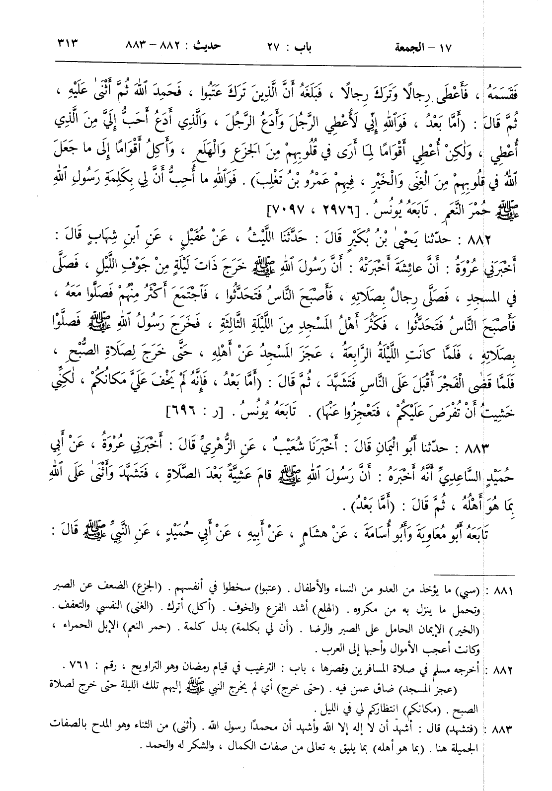 تابعه أبو معاوية وأبو أسامة عن هشام عن أبيه عن أبي حميد عن النبي صلى الله عليه و سلم قال ( أما بعد ) . تابعه العدني عن سفيان في ( أما بعد )