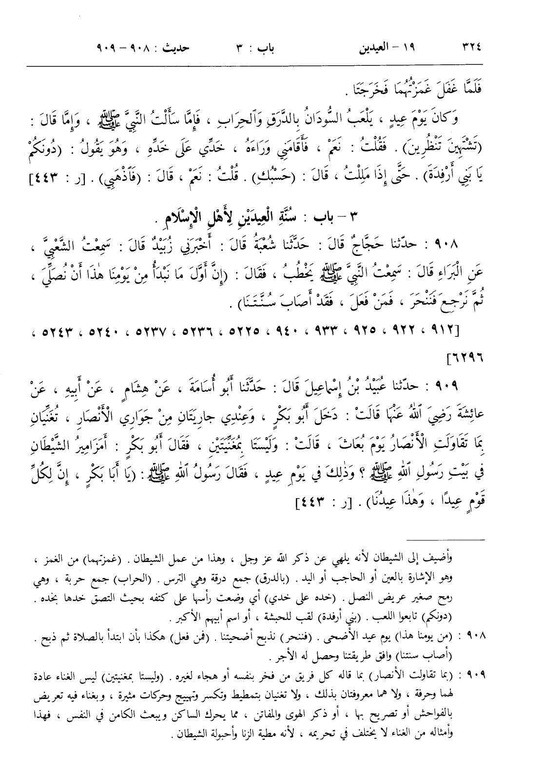 : دخل أبو بكر وعندي جاريتين من جواري الأنصار تغنيان بما تقاولت الأنصار يوم بعاث قالت وليستا بمغنيتين فقال أبو بكر أمزامير الشيطان في بيت رسول الله صلى الله عليه و سلم ؟ وذلك في يوم عيد فقال رسول الله صلى الله عليه و سلم ( يا أبا بكر إن لكل قوم عيدا وهذا عيدنا )