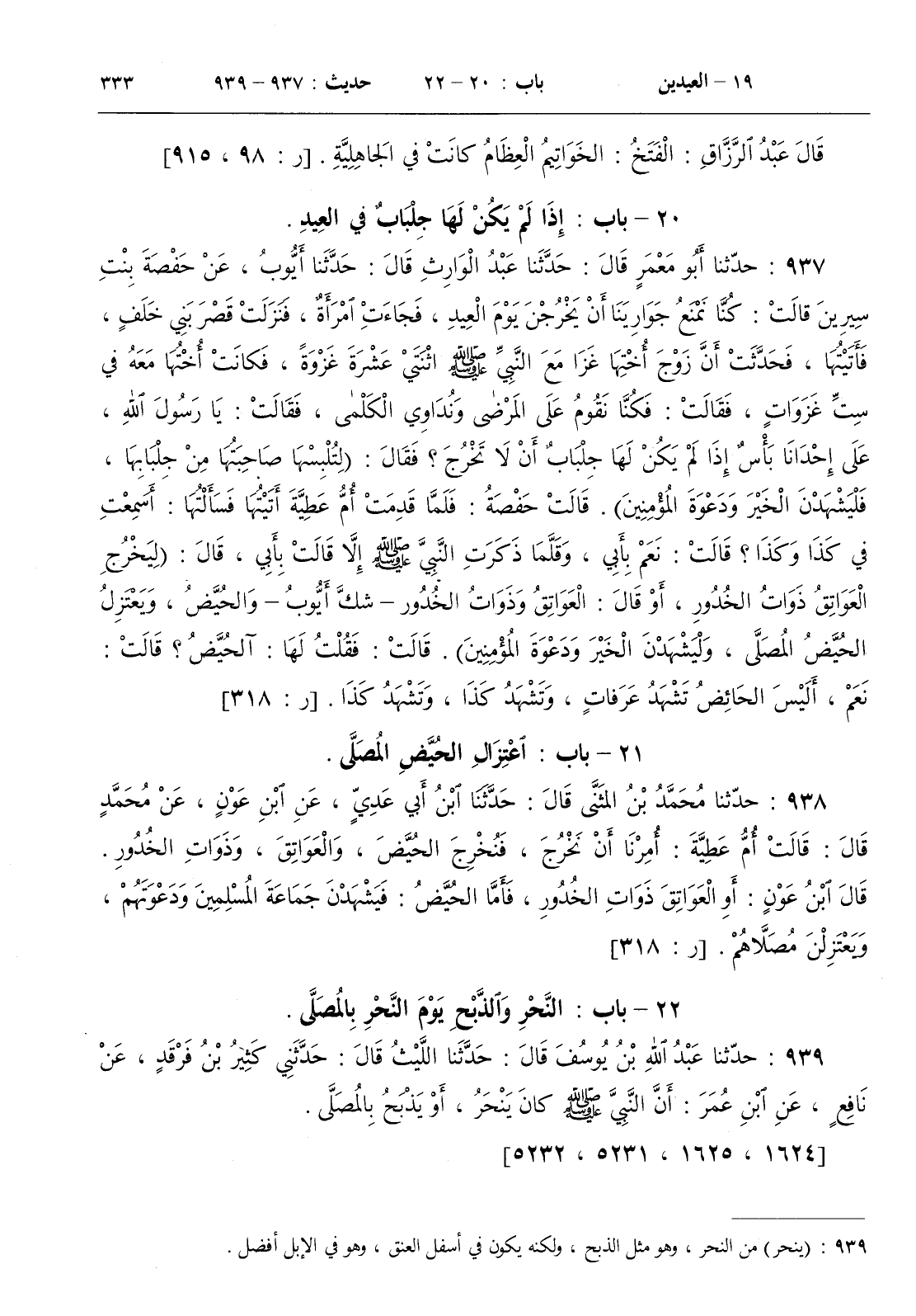 : كنا نمنع جوارينا أن يخرجن يوم العيد فجاءت امرأة فنزلت قصر بني خلف فأتيتها فحدثت أن زوج أختها غزا مع النبي صلى الله عليه و سلم اثنتي عشرة غزوة فكانت أختها معه في ست غزوات فقالت فكنا نقوم على المرضى ونداوي الكلمى فقالت يا رسول الله على إحدانا بأس إذا لم يكن لها جلبات أن لاتخرج ؟ فقال ( لتلبسها صاحبيها من جلبابها فليشهدن الخير ودعوة المؤمنين ) . قالت حفصة فلما قدمت أم عطية أتيتها فسألتها أسمعت في كذا وكذا ؟ قالت نعم بأبي وقلما ذكرت النبي صلى الله عليه و سلم إلا قالت بأبي قال ( ليخرجن العواتق ذوات الخدور أو قال العواتق وذوات الخدور - شك أيوب - والحيض ويعتزل الحيض المصلى وليشهدن الخير ودعوة المؤمنين ) . قالت فقلت لها آلحيض ؟ قالت نعم أليس الحائض تشهد عرفات وتشهد كذا وتشهد كذا