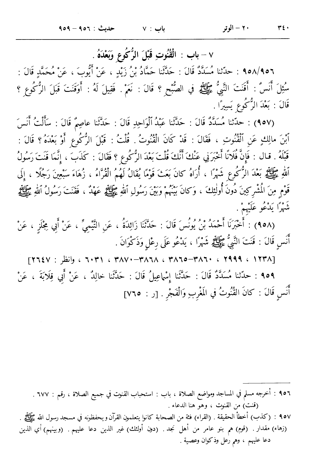 : سألت أنس بن مالك عن القنوت فقال قد كان القنوت . قلت قبل الركوع أو بعده ؟ قال قبله . قال فإن فلانا أخبرني عنك أنك قلت بعد الركوع ؟ فقال كذب إنما قنت رسول الله صلى الله عليه و سلم بعد الركوع شهرا أراه كان بعث قوما يقال لهم الققراء زهاء سبعين رجلا إلى قوم من المشركين دون أولئك وكان بينهم وبين رسول الله صلى الله عليه و سلم عهد فقنت رسول الله صلى الله عليه و سلم شهرا يدعوا عليهم
