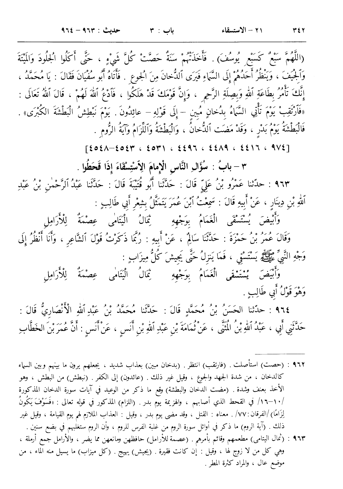 [ ش ( قحطوا ) أصابهم القحط وهو الجدب وقلة المطر . ( نتوسل ) نتشفع ونتقرب ونطلب السقيا ]