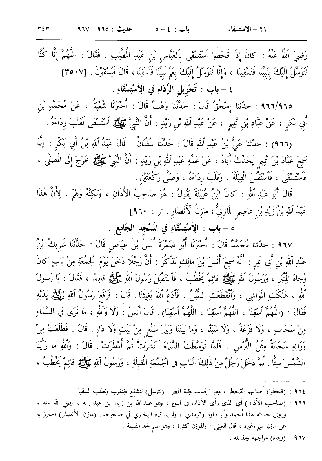 : أن رجلا دخل يوم الجمعة من باب كان وجاه المنبر ورسول الله صلى الله عليه و سلم قائم يخطب فاستقبل رسول الله صلى الله عليه و سلم قائما فقال يا رسول الله هلكت المواشي وانقطعت السبل فادع الله يغيثنا . قال فرفع رسول الله صلى الله عليه و سلم يديه فقال ( اللهم اسقينا اللهم اسقنا اللهم اسقنا ) . قال أنس لا والله ما نرى في السماء من سحاب ولا قزعة ولا شيئا وما بيننا وبين سلع من بيت ولا دار . قال فطلعت من ورائه سحابة مثل الترس فلما توسطت السماء انتشرت ثم أمطرت . قال والله ما رأينا الشمس ستا . ثم دخل رجل من ذلك الباب في الجمعة المقبلة ورسول الله صلى الله عليه و سلم قائم يخطب فاستقبله قائما فقال يا رسول الله هلكت الأموال وانقطعت السبل فادع الله يمسكها . قال فرفع رسول الله يديه ثم قال ( اللهم حولينا ولا علينا اللهم على الآكام والجبال والآجام والظراب والأودية ومنابت الشجر ) . قال فانقطعت وخرجنا نمشي في الشمس