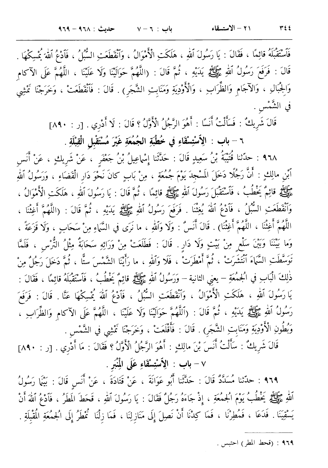 : أن رجلا دخل المسجد يوم الجمعة من باب كان نحو دار القضاء ورسول الله صلى الله عليه و سلم قائم يخطب فاستقبل رسول الله صلى الله عليه و سلم قائما ثم قال يا رسول الله هلكت الأموال وانقطعت السبل فادع الله يغثنا . فرفع رسول الله صلى الله عليه و سلم يديه ثم قال ( اللهم أغثنا اللهم أغثنا اللهم أغثنا ) . قال أنس ولا والله ما نرى في السماء من سحاب ولا قزعة وما بيننا وبين سلع من بيت ولا دار . قال فطلعت من ورائه سحابة مثل الترس فلما توسطت السماء انتشرت ثم أمطرت . قال والله ما رأينا الشمس ستا . ثم دخل رجل من ذلك الباب في الجمعة - يعني الثانية - ورسول الله صلى الله عليه و سلم قائم يخطب فاستقبله قائما فقال يا رسول الله هلكت الأموال وانقطعت السبل فادع الله يمسكها عنا . قال فرفع رسول الله يديه ثم قال ( اللهم حولينا ولا علينا اللهم على الآكام والظراب وبطون الأودية ومنابت الشجر ) . قال فأقلعت وخرجنا نمشي في الشمس