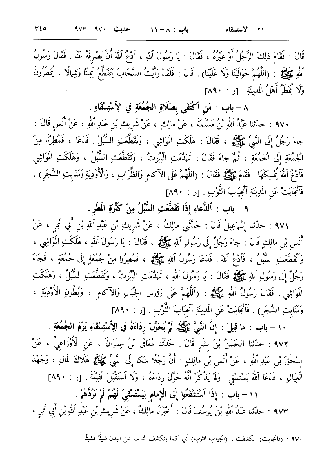: جاء رجل إلى النبي صلى الله عليه و سلم فقال يا رسول الله هلكت المواشي وتقطعت السبل فدع الله . فدعا الله فمطرنا من الجمعة إلى الجمعة فجاء رجل إلى النبي صلى الله عليه و سلم فقال يا رسول الله تهدمت البيوت وتقطعت السبل وهلكت المواشي فقال رسول الله صلى الله عليه و سلم ( اللهم على ظهور الجبال والآكام وبطون الأودية ومنابت الشجر ) . فانجابت عن المدينة انجياب الثوب