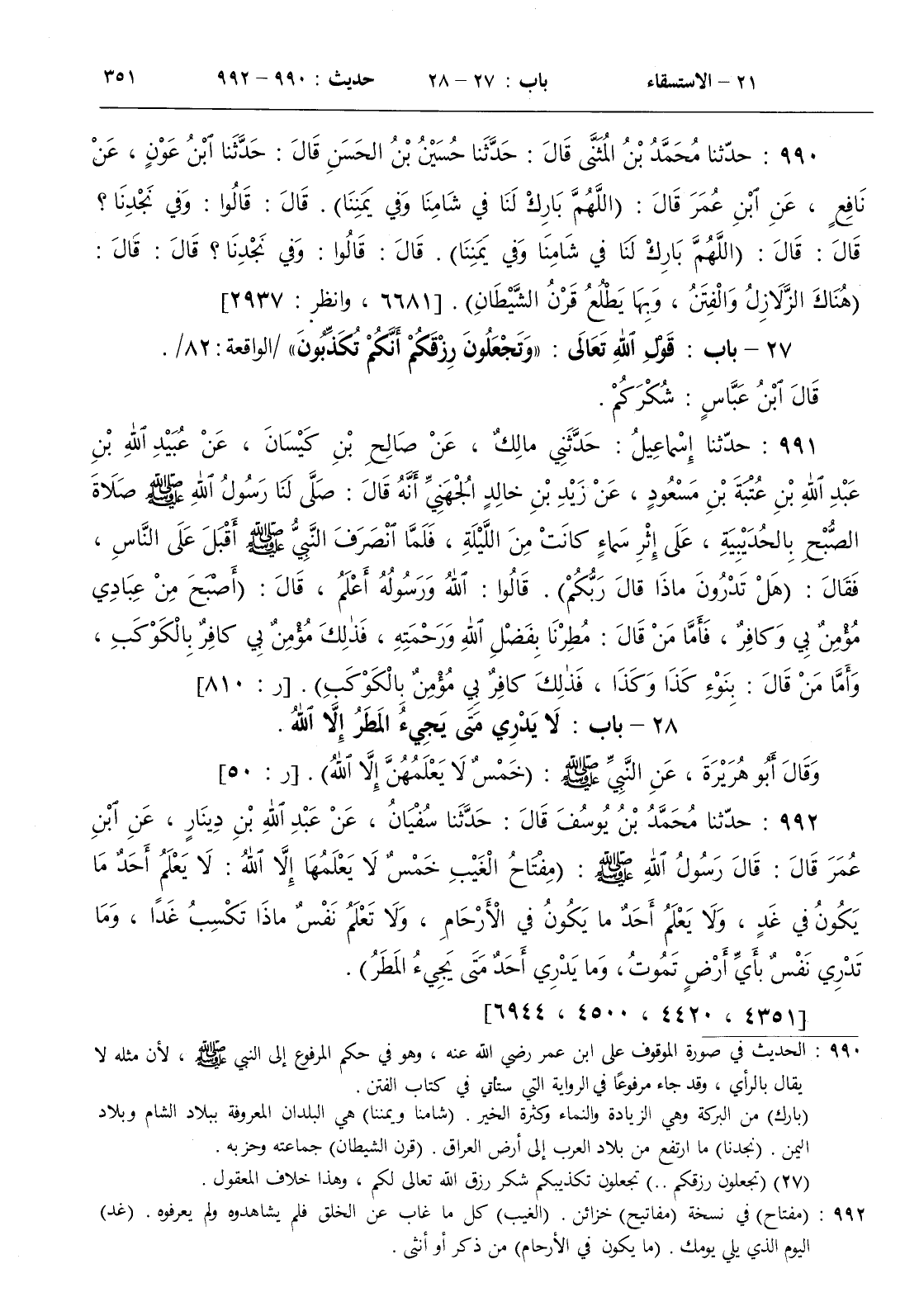 991 - حدثنا إسماعيل حدثني مالك عن صالح بن كيسان عن عبيد الله بن عبد الله بن عتبة بن مسعود عن زيد بن خالد الجهني أنه قال : صلى لنا رسول الله صلى الله عليه و سلم صلاة الصبح بالحديبية على إثر سماء كانت من الليلة فلما انصرف النبي صلى الله عليه و سلم أقبل على الناس فقال هل تدرون ماذا قال ربكم قالوا الله ورسوله أعلم قال أصبح من عبادي مؤمن بي وكافر فأما من قال مطرنا بفضل الله ورحمته فذلك مؤمن بي كافر بالكوكب وأما من قال بنوء كذا وكذا فذلك كافر بي مؤمن بالكوكب