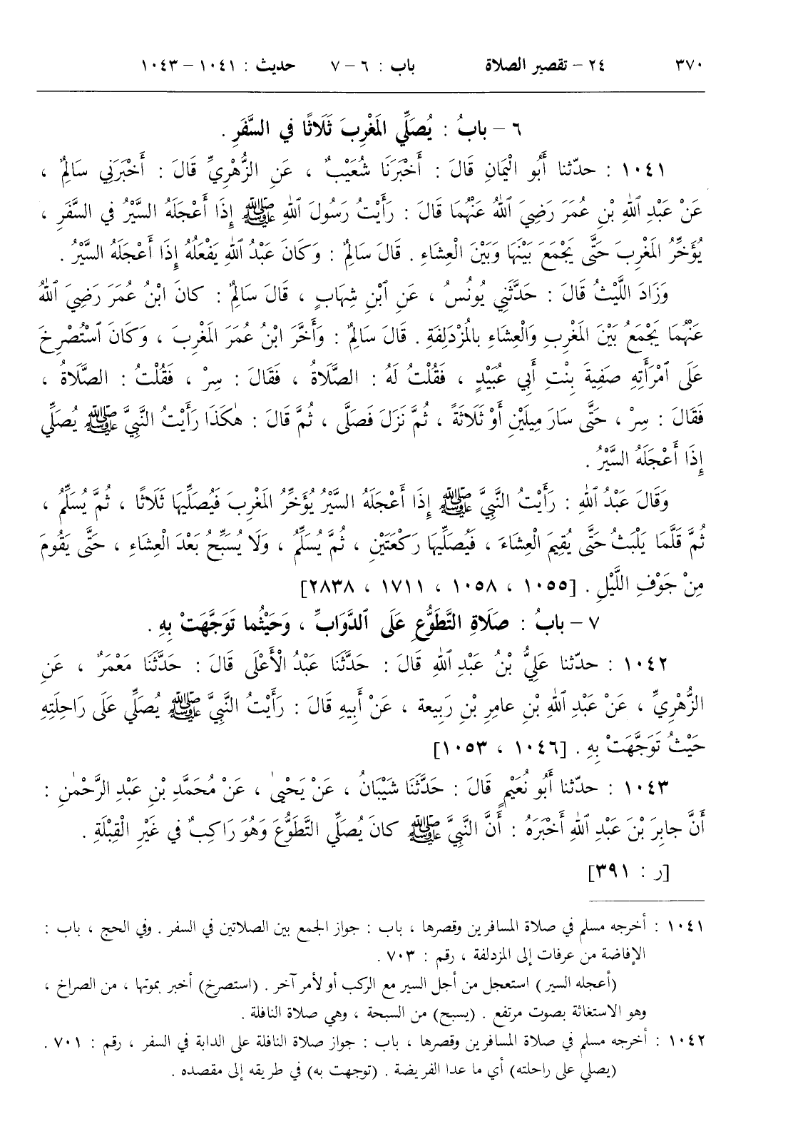 وقال عبد الله رأيت النبي النبي صلى الله عليه و سلم إذا أعجله السير يؤخر المغرب فيصليها ثلاثا ثم يسلم ثم قلما يلبث حتى يقيم العشاء فيصليها ركعتين ثم يسلم ولا يسبح بعد العشاء حتى يقوم من جوف الليل
