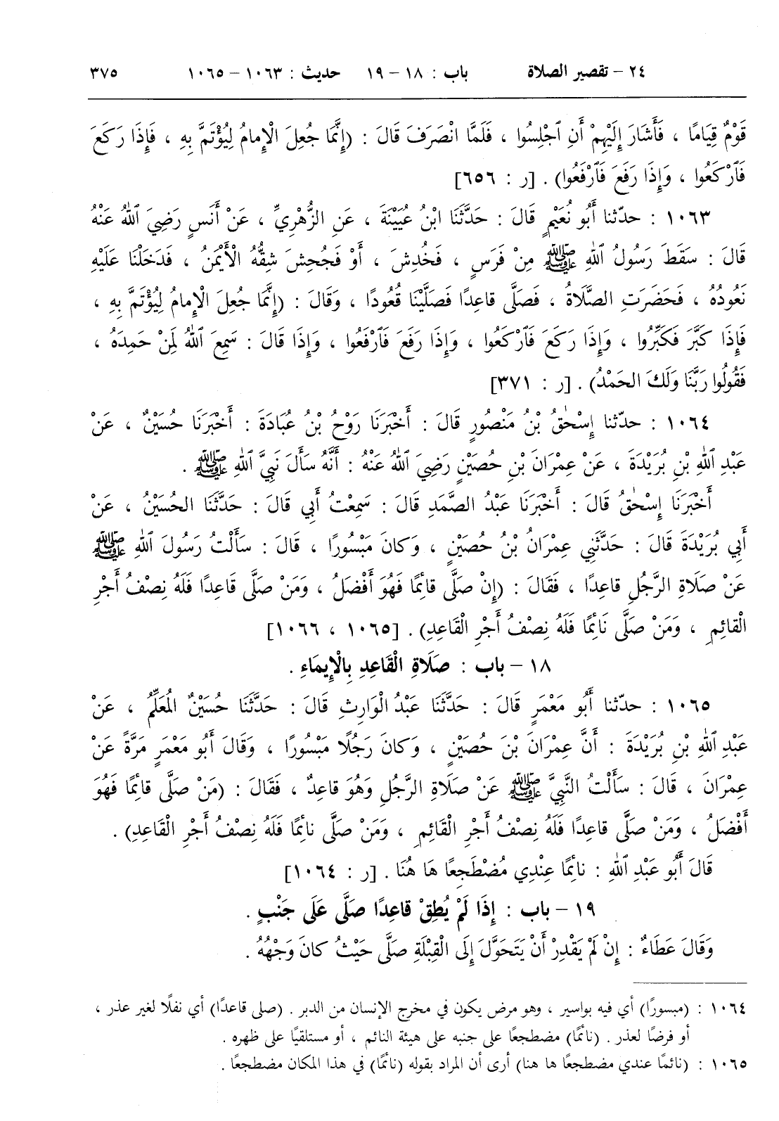 : حدثني عمران بن حصين وكان مبسورا قال سألت رسول الله صلى الله عليه و سلم عن صلاة الرجل قاعدا فقال ( إن صلى قائما فهو أفضل ومن صلى قاعدا فله نصف أجر القائم ومن صلى نائما فله نصف أجر القاعد )