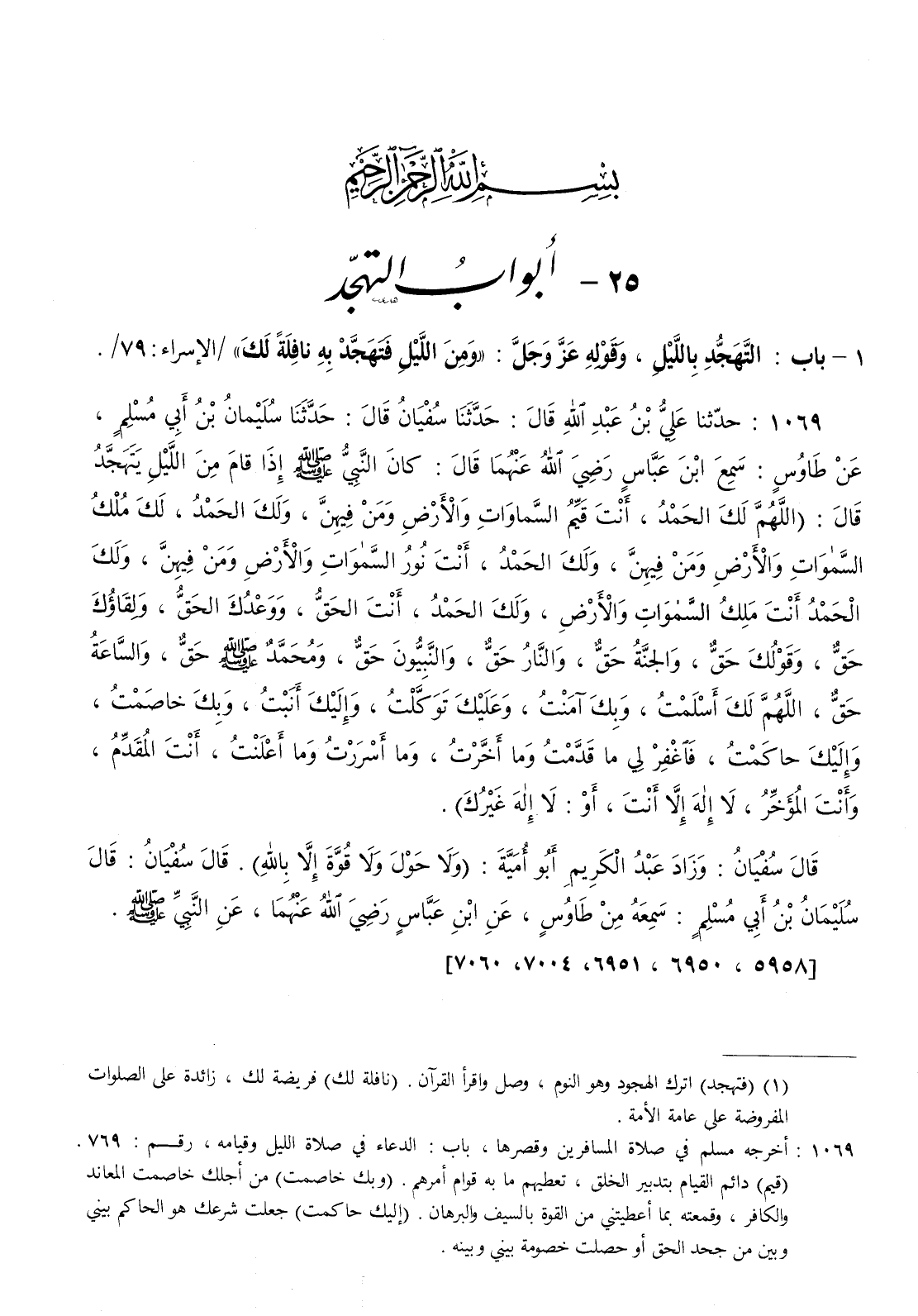 : كان النبي صلى الله عليه و سلم إذا قام من الليل يتهجد قال ( اللهم لك الحمد أنت قيم السماوات والأرض ومن فيهن ولك الحمد لك ملك السموات والأرض ومن فيهن ولك الحمد أنت ملك السموات والأرض ولك الحمد أنت الحق ووعدك الحق ولقاؤك حق وقولك حق والجنة حق والنار حق والنبيون حق ومحمد صلى الله عليه و سلم حق والساعة حق اللهم لك أسلمت وبك آمنت وعليك توكلت وإليك أنبت وبك خاصمت وإليك حاكمت فاغفر لي ما قدمت وما أخرت وما أسررت وما أعلنت أنت المقدم وأنت المؤخر لا إله إلا أنت أو لاإله غيرك )